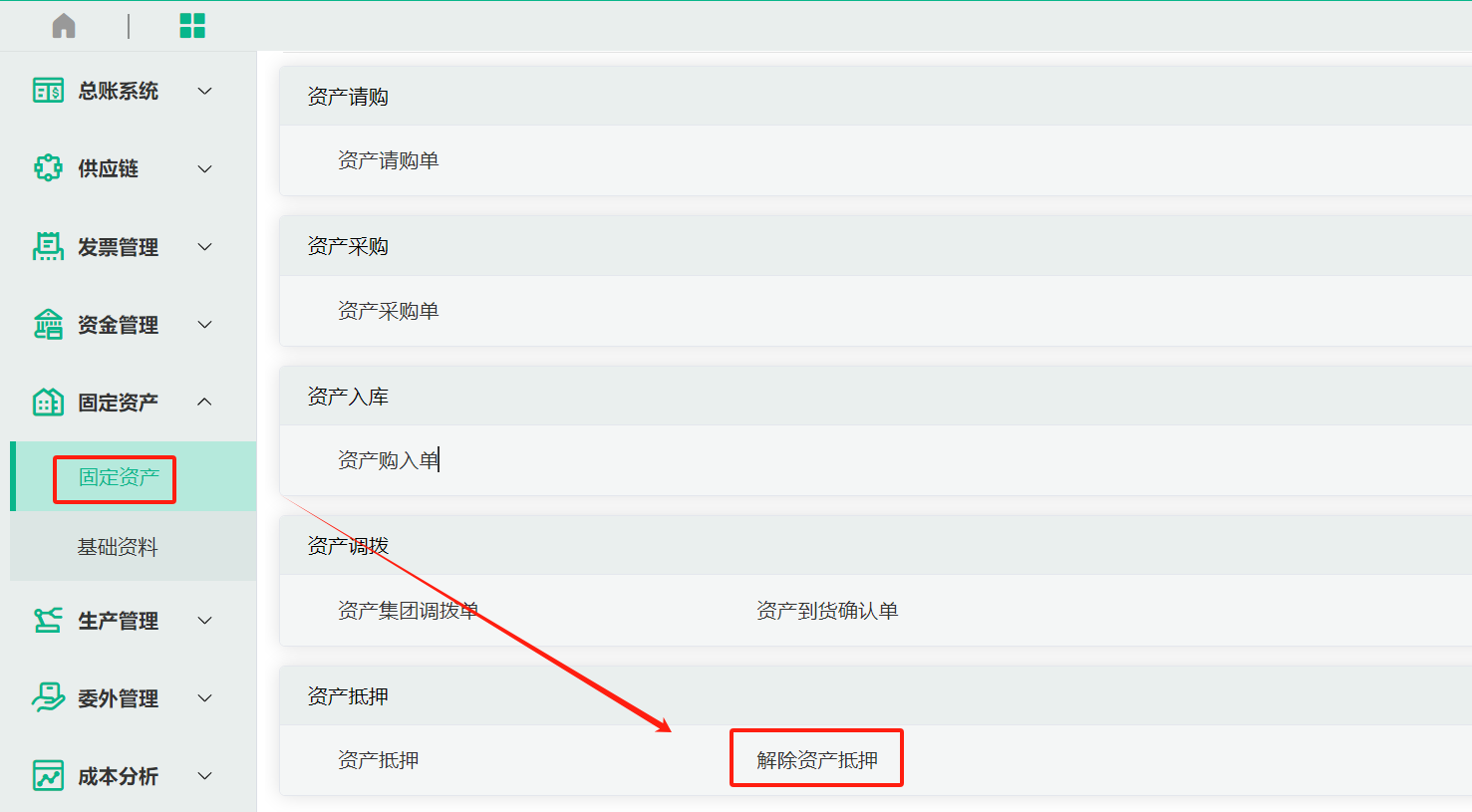 菜单位置:固定资产—资产抵押—解除资产抵押