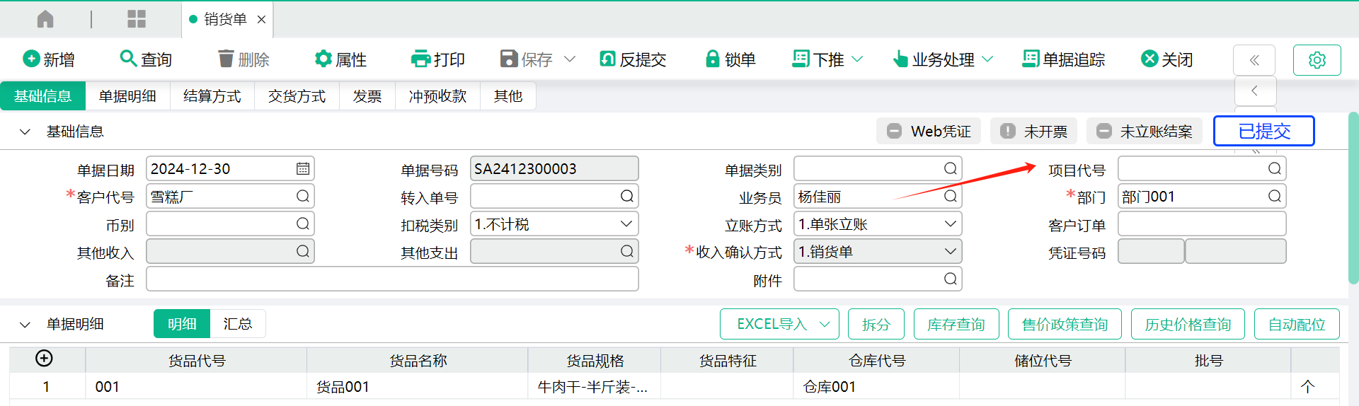 4、操作员007杨小羽登打销货单,单据存盘,单据右上角审核状态【未提交】。