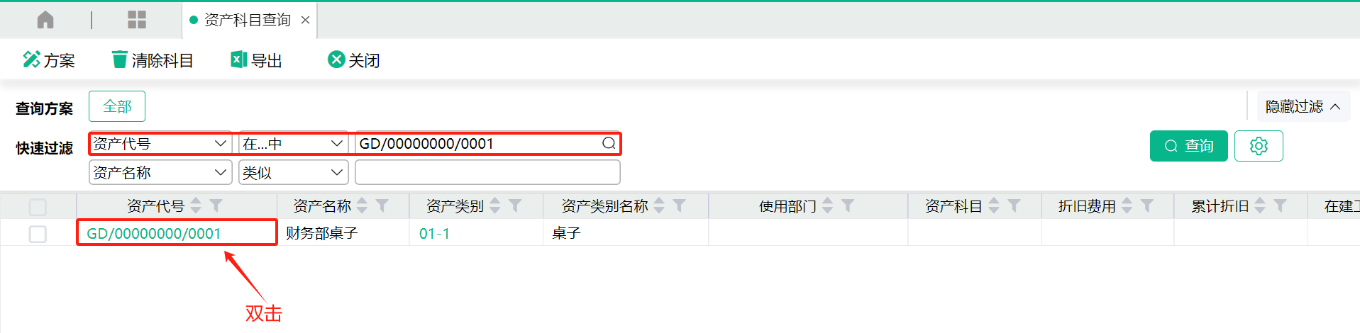 - 点击菜单,进入资产科目查询画面,点击要增加会计科目的“资产代号”;也可以根据过滤条件过滤要修改的资产代号;