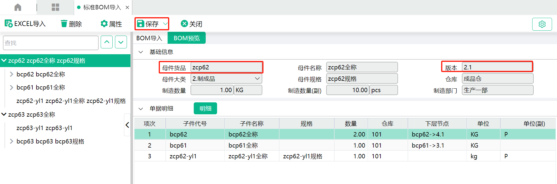(2)检测数据是否正确(点击左边的结构树,点击BOM预览界面检查数据),点击保存,提示:保存成功。表示数据成功导入到标准BOM。