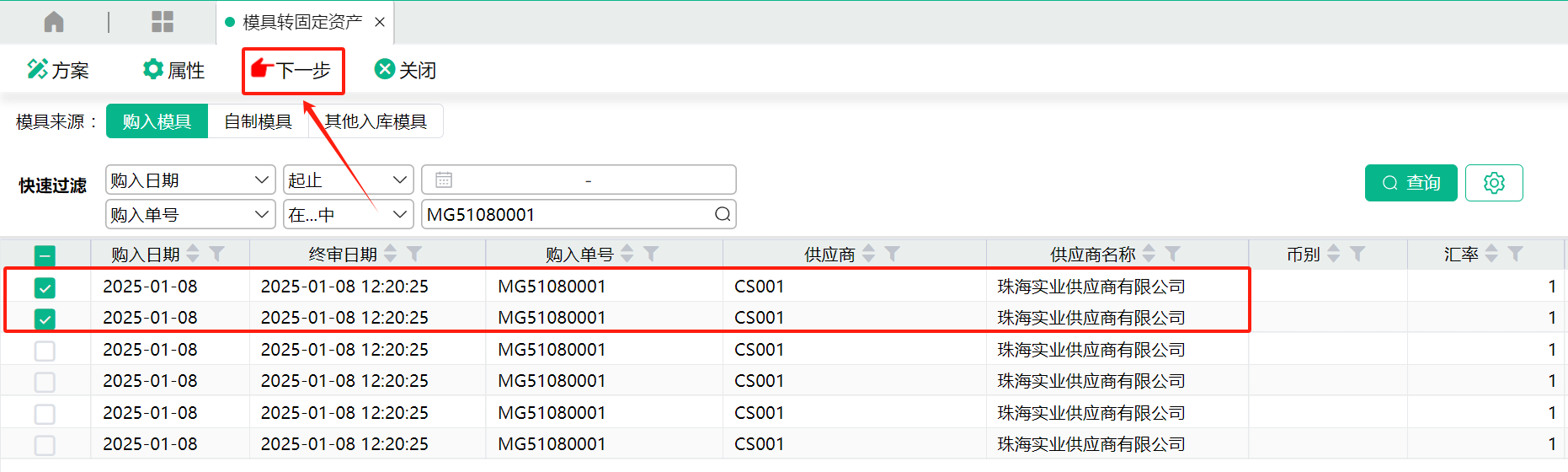 (1)、根据条件过滤出模具购入单记录,此处过滤出的模具购入单均为“ 未转过 ”资产卡片的记录