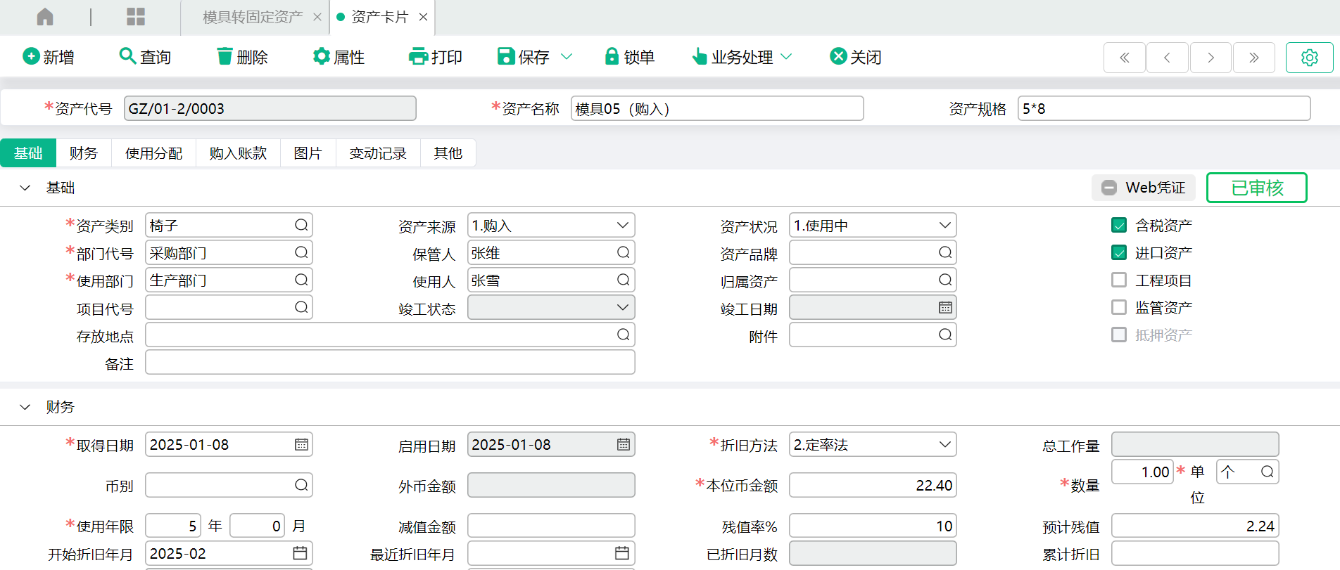 通过此单可以将模具购入单、自制模具入库单、模具出入库单转成资产卡片。