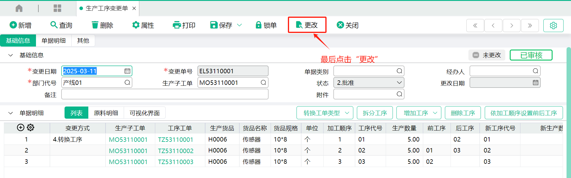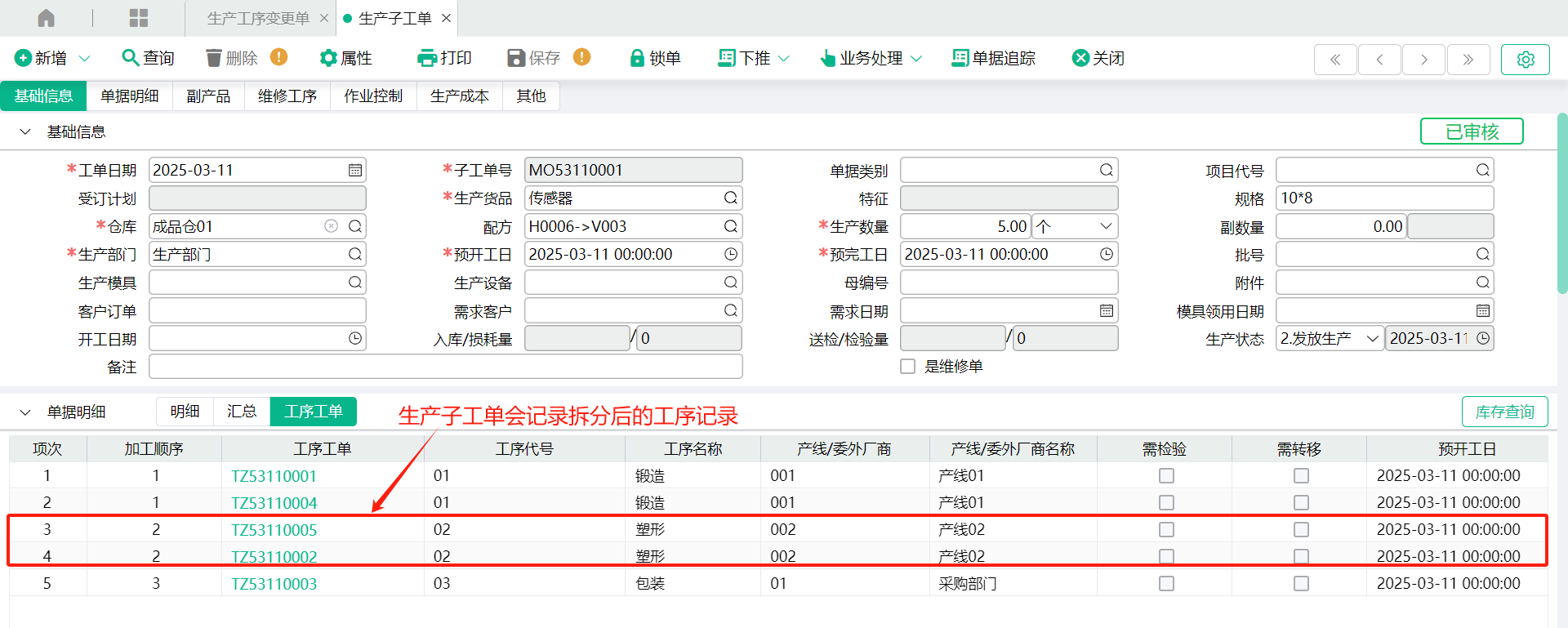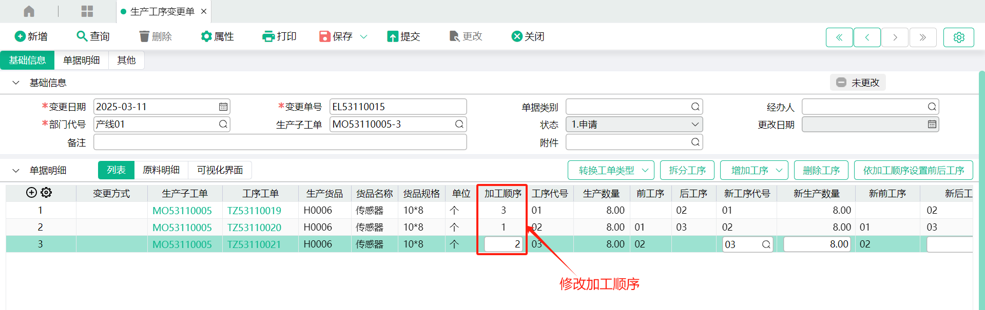 (1)转入来源生产子工单,工序会带入到变更单表身,如下: