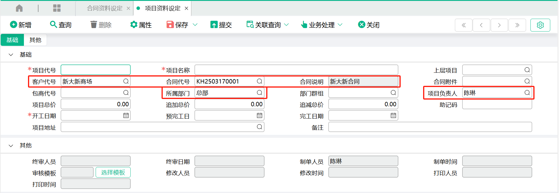 (1)、新增【合同资料】保存后,当【项目代号】栏位为空时,可下推到【项目资料】页面,新增输入项目资料,保存后,会回写【合同资料设定】页面的【项目代号】栏位值。