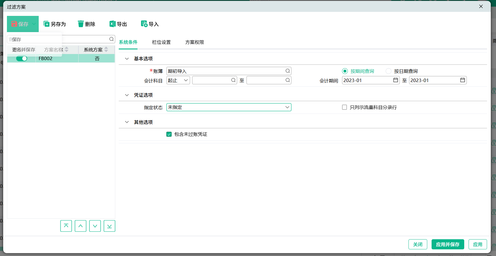 (1)进入页面后,在过滤方案窗口选择【账簿】、【会计期间】、【指定状态】等条件。点击【应用】方案后,页面将自动查询并显示符合条件的凭证。