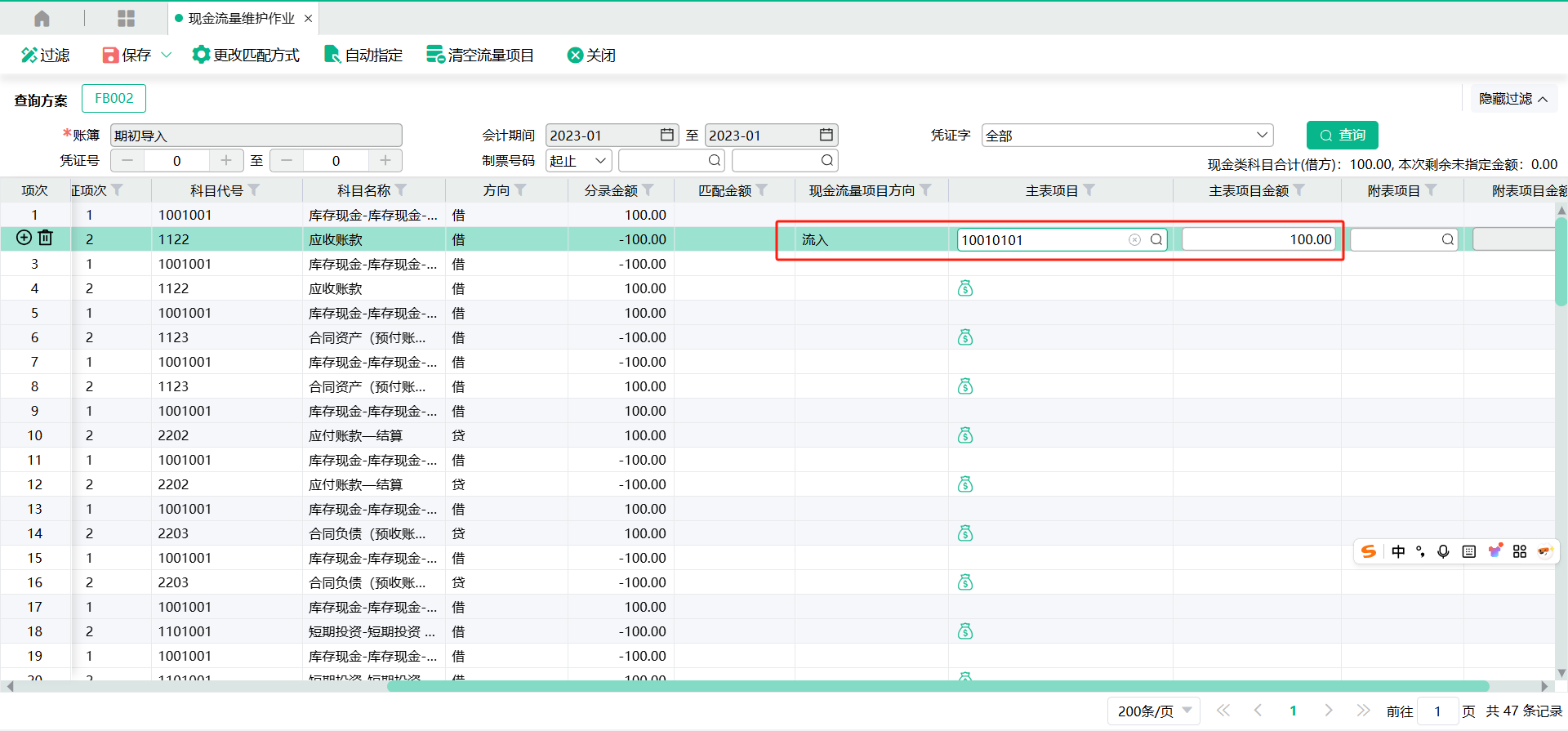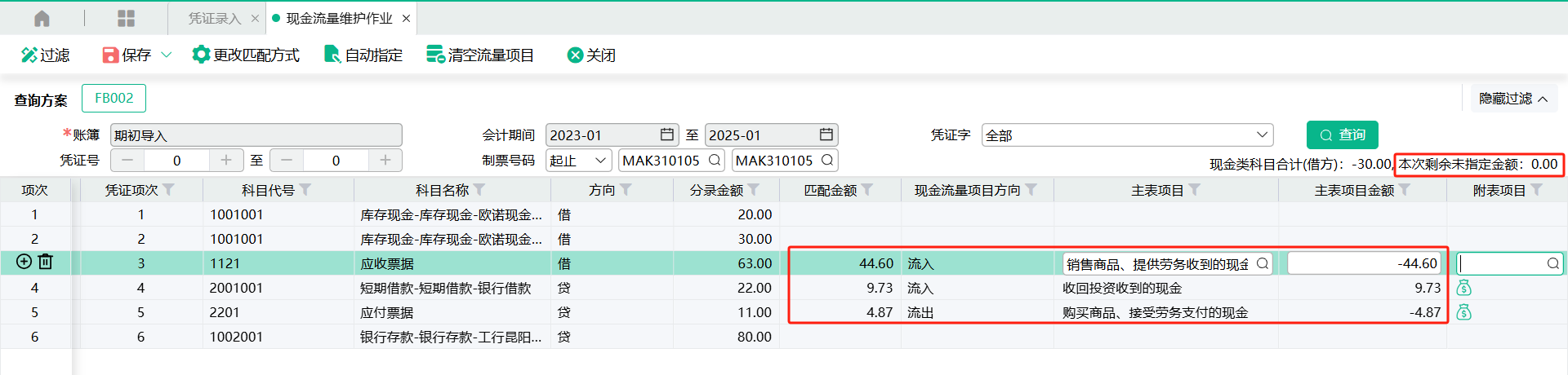(1)选择【不匹配】方式时,其匹配结果与【自动指定】功能一致。根据【科目现金流量设置】的设定值直接带入主表项目/附表项目。匹配金额与凭证分录的分录金额一致。