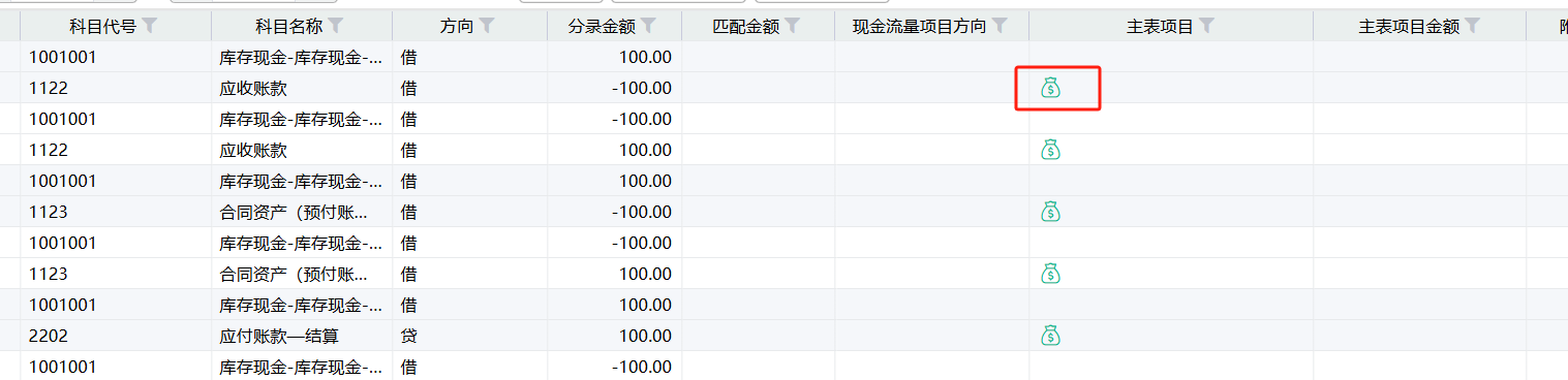 (1)查询符合的凭证后,需要补充现金流量项目的分录行,将在【主表项目】或者【附表项目】显示“钱袋”标记。