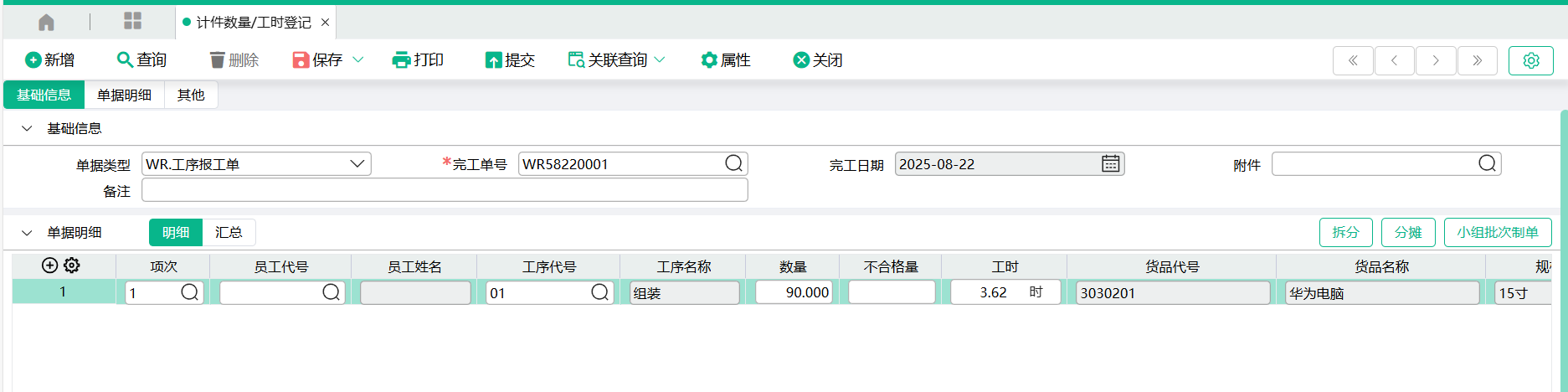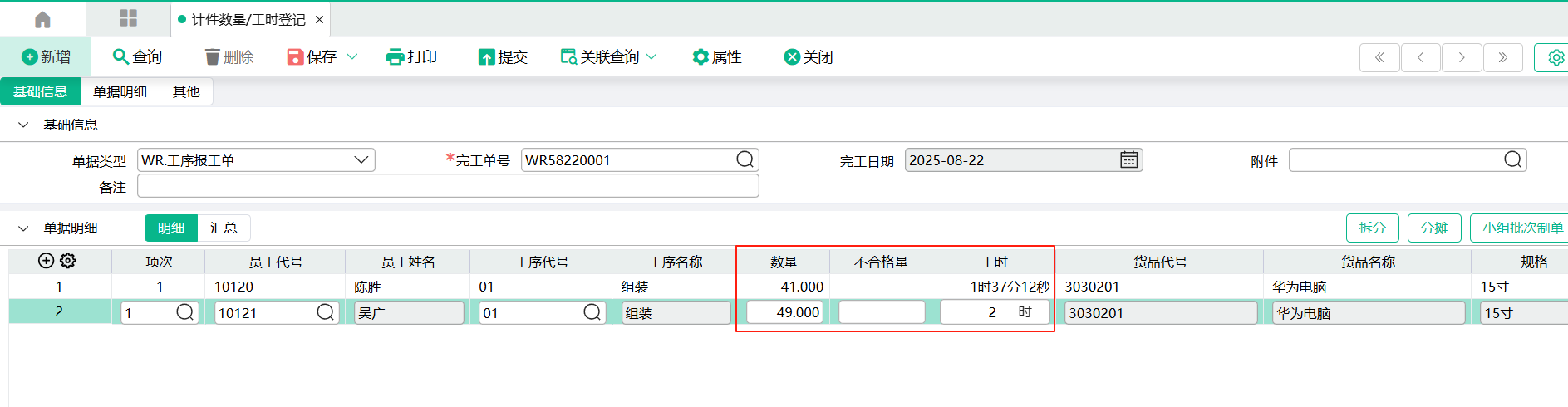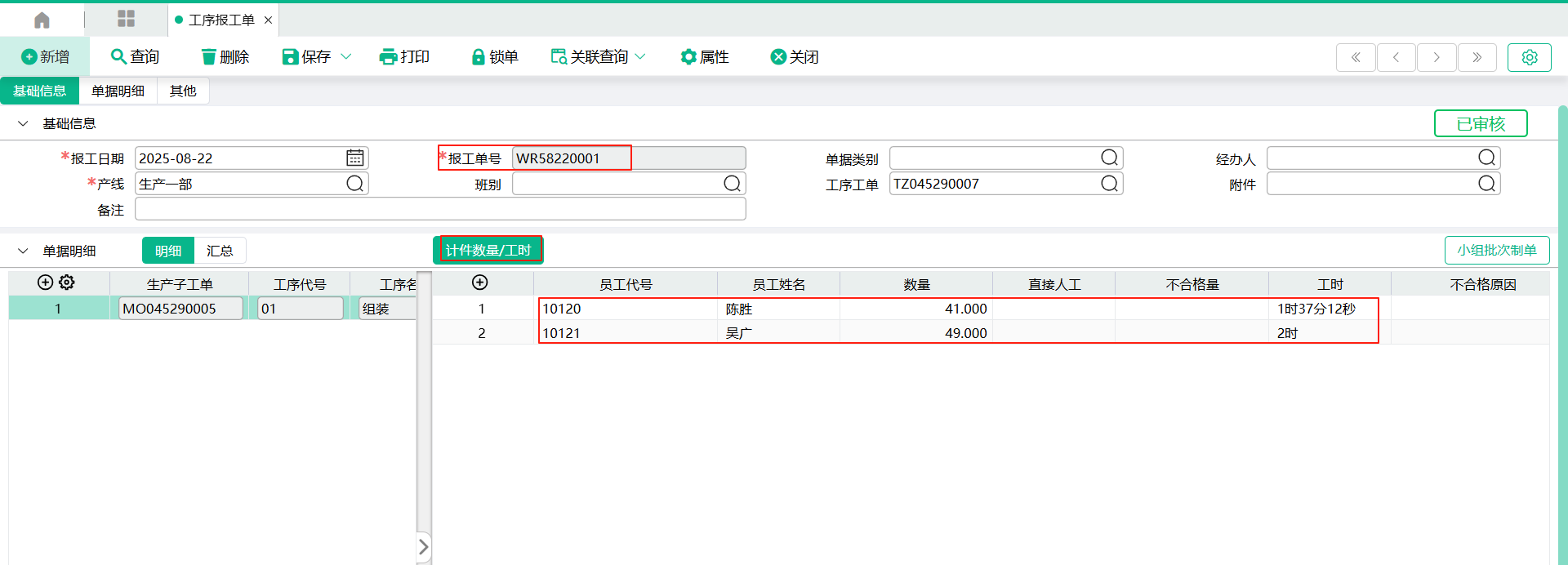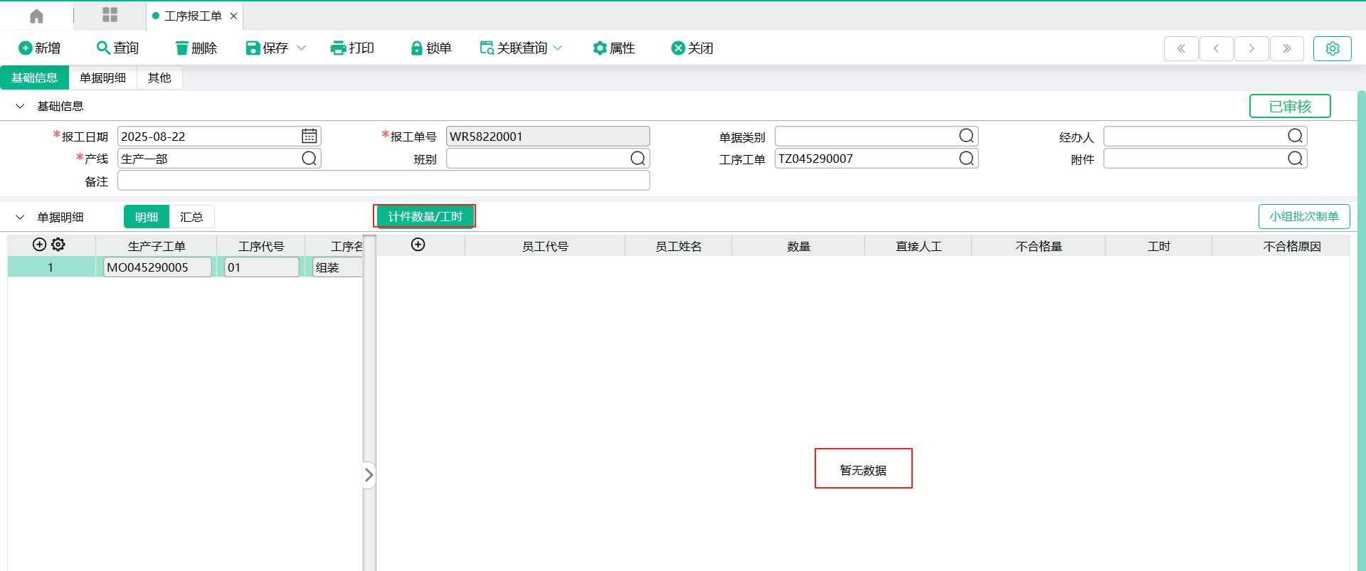 (6)回到对应的单据里查询时,计件数量/工时也会出现对应的数据。