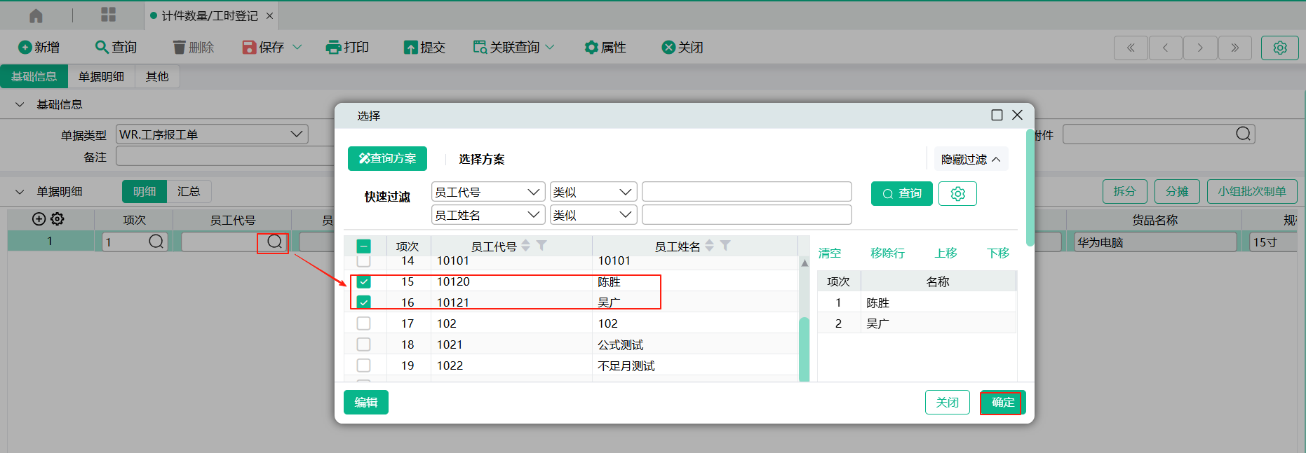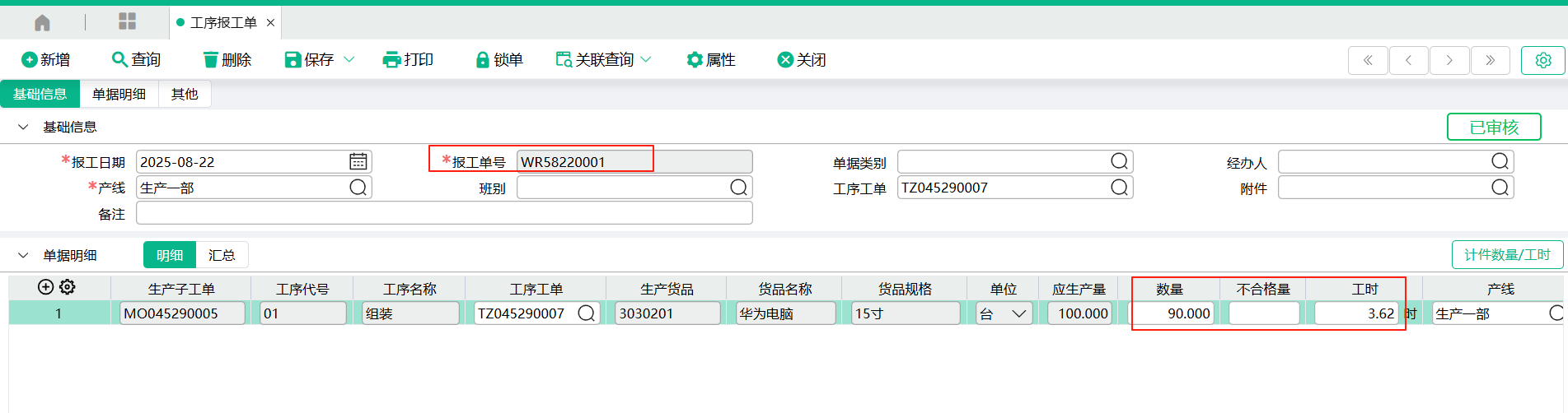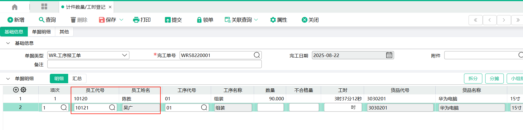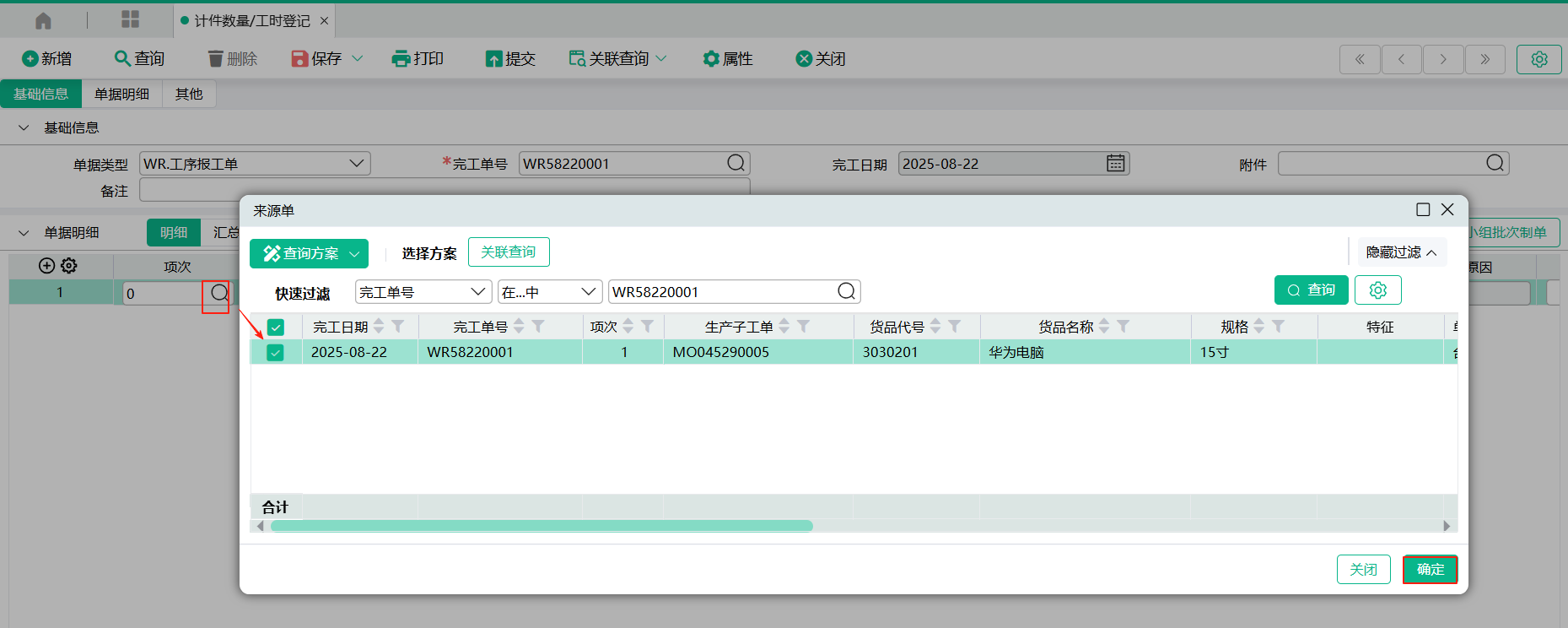(6)回到对应的单据里查询时,计件数量/工时也会出现对应的数据。