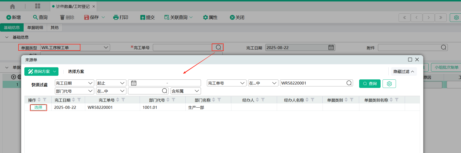 (2)打开计件数量/工时登记,表头单据类型选择WR.工序报工单,完工单号查询视窗选择该单据。