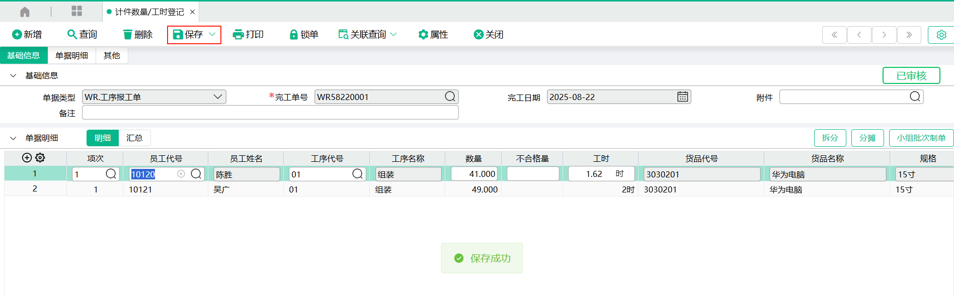 (5)点击保存,即计件数量/工时登记操作完毕。