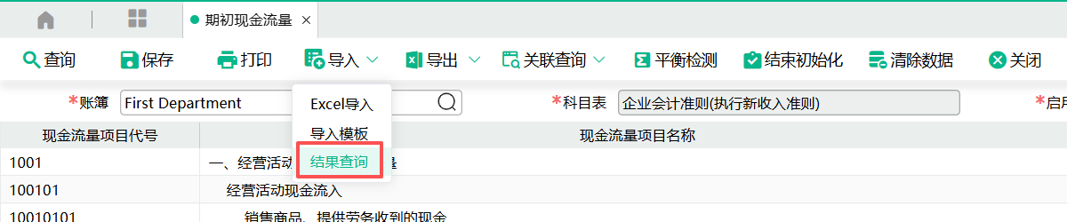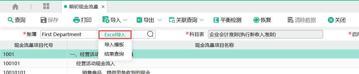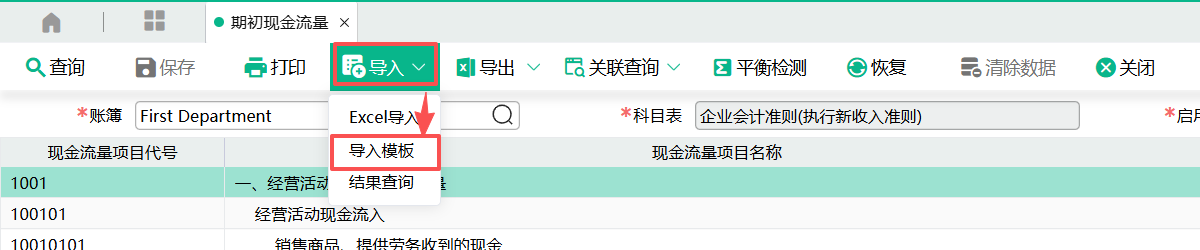 (1)进入页面,点击【导入】按钮下拉菜单中的【导入模板】,点击下载“期初现金流量模板”。