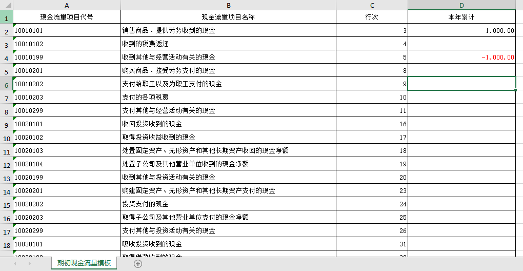(2)根据情况,在Excel文件中输入各个现金流量的“本年累计”金额。