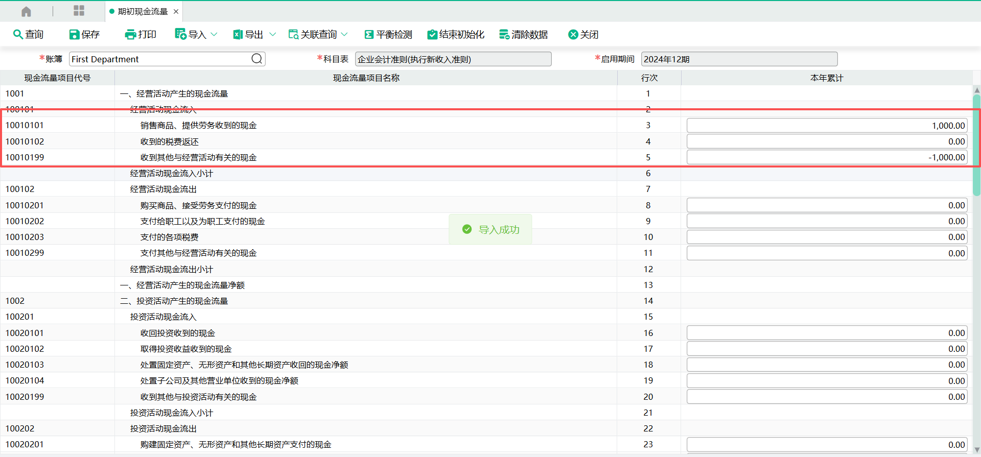 - 最后【期初现金流量】中【六、期末现金及现金等价物余额】的金额,需与【期初科目余额】中现金科目的【期初余额】金额一致。