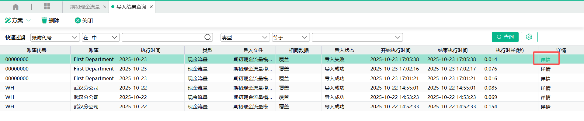 (5)导入失败的,请点击【导入】按钮下拉菜单中的【结果查询】,在失败记录行点击【详情】下载失败记录文档。