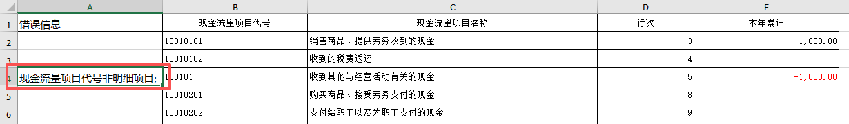 (4)选择“按导入模板导出”,是根据导入模板的样式,仅导出有数据行的内容。用户可在这份导出文件的基础上补充现金流量的本年累计明细,保存后,可使用该份文件直接导入系统,不需要再复制到模板中再导入。