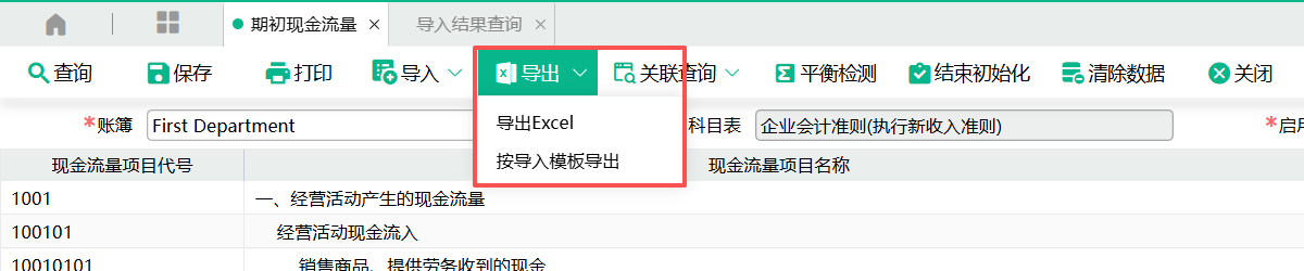 (1)对于已录入的期初现金流量,可导出为EXCEL文件。