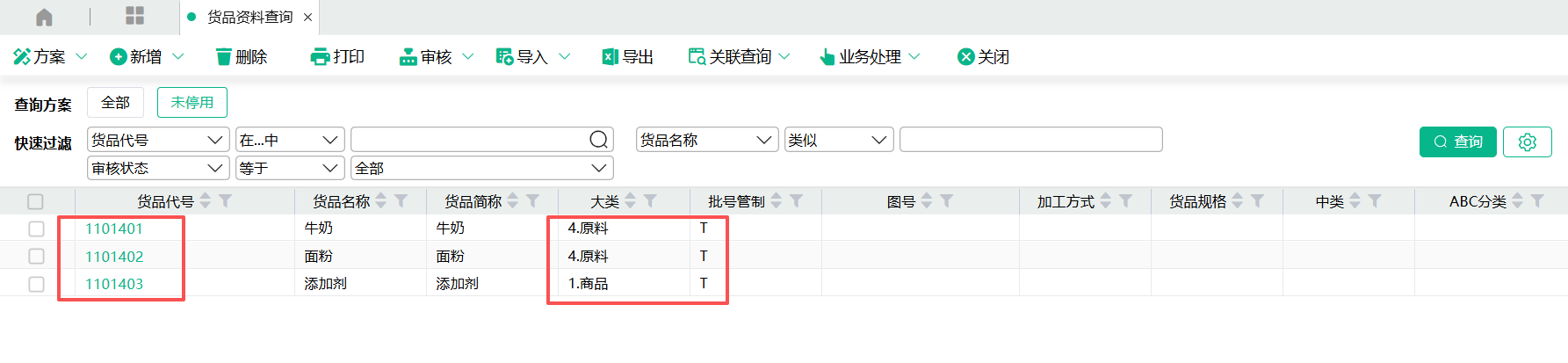 (2)在货品资料设置三个货品,1101401和1101402是批号管制,大类为4.原料;1101403也是批号管制,但是大类为1.商品。