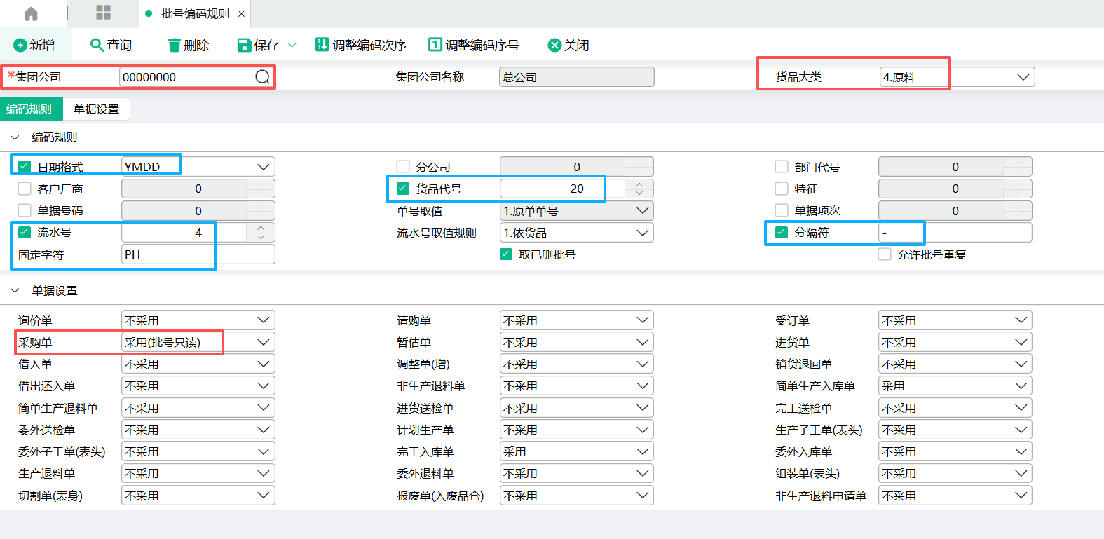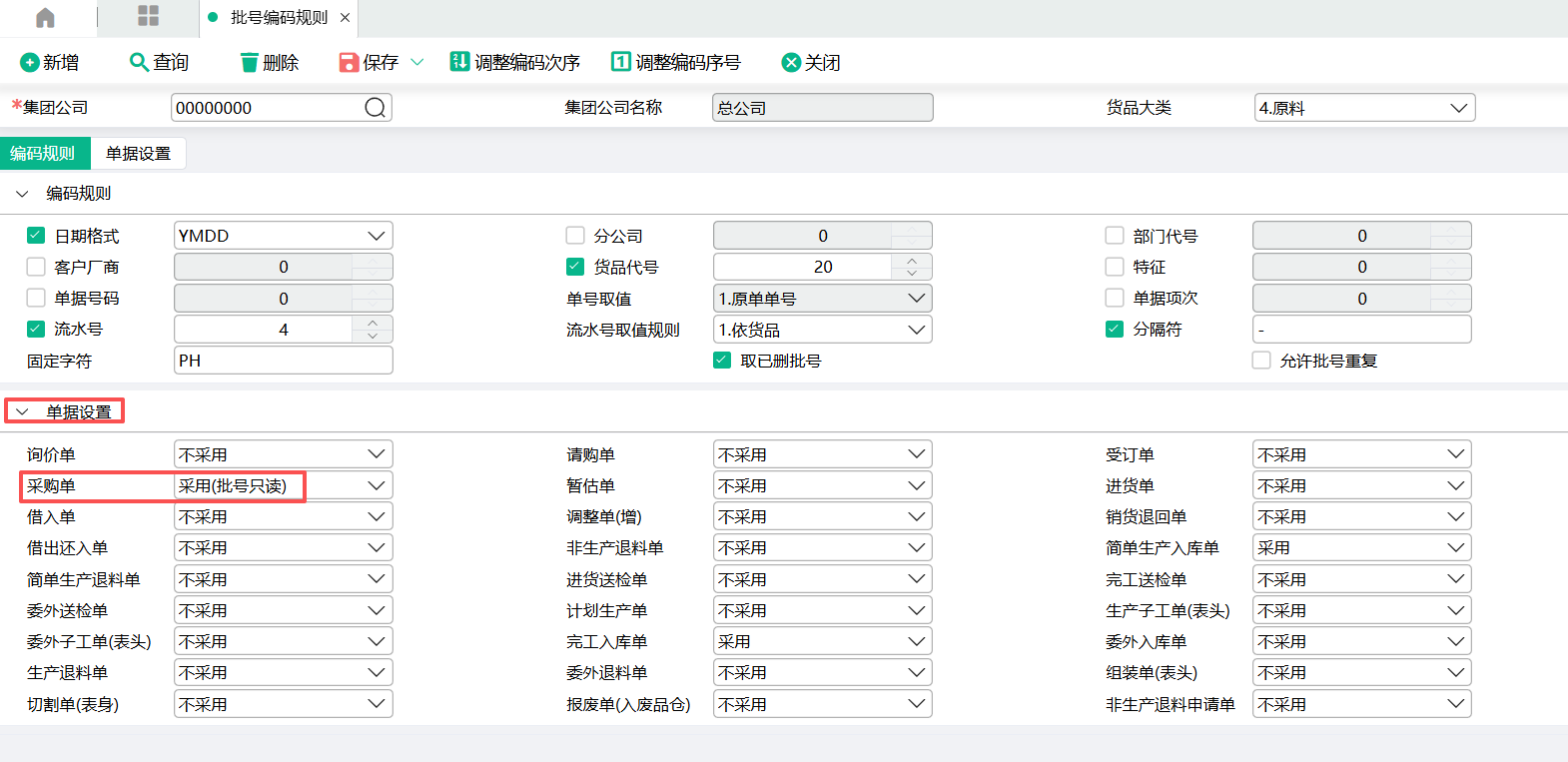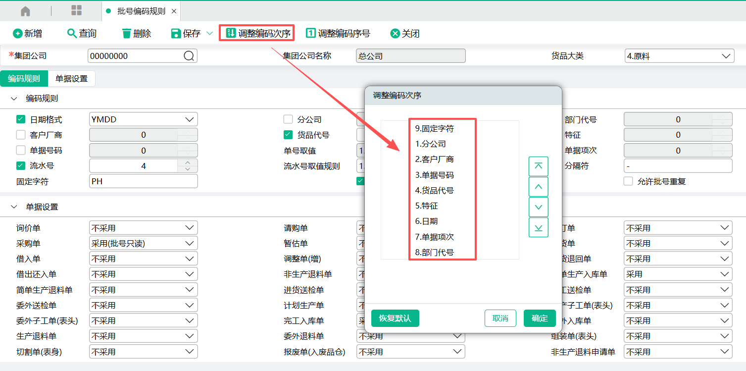 (1)在批号编码规则里设置好数据。集团公司选择00000000总公司,货品大类选择4.原料。日期格式,货品代号,固定字符,分隔符,流水号都参与批号编码。采购单选择采用(批号只读)。调整编码次序把固定字符放最前面,批号编码生成顺序为:固定字符-货品代号-日期-流水号(流水号是不能调整的,系统写死在最后面)。