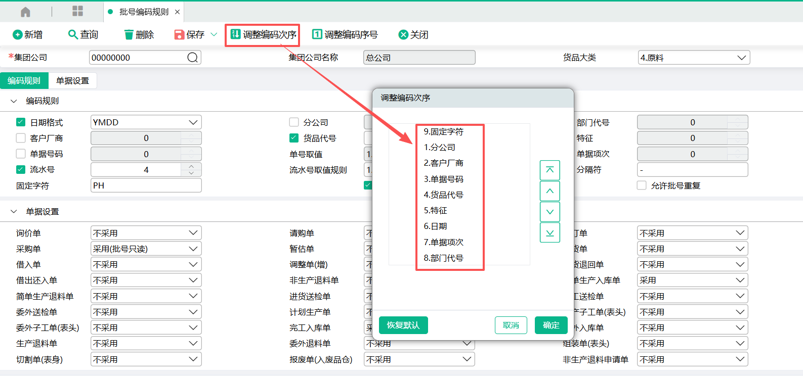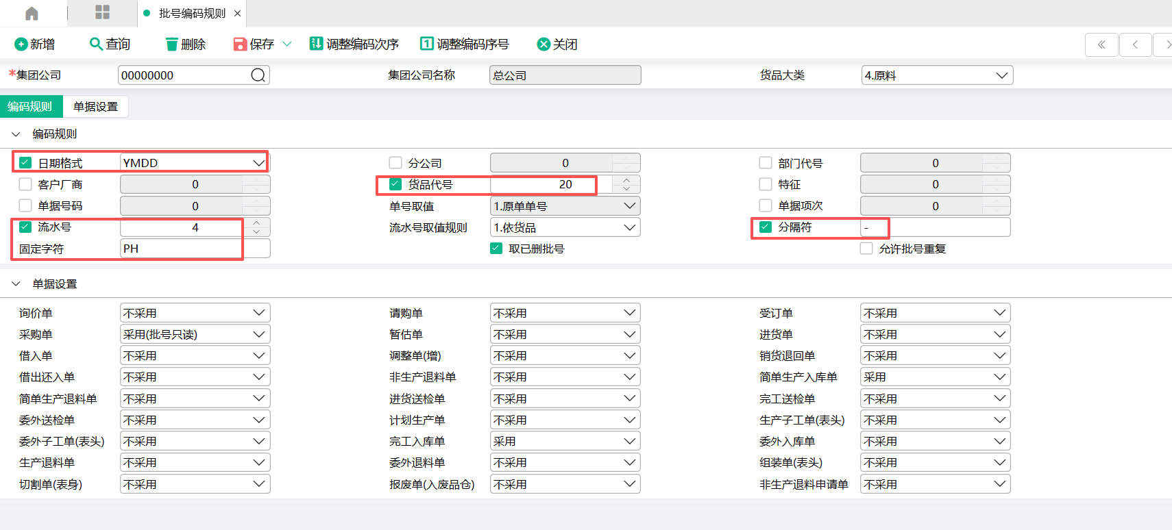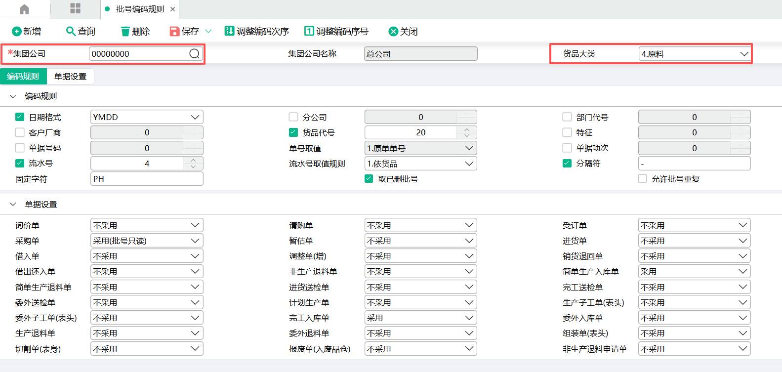 (1)在批号编码规则里设置好数据。集团公司选择00000000总公司,货品大类选择4.原料。日期格式,货品代号,固定字符,分隔符,流水号都参与批号编码。采购单选择采用(批号只读)。调整编码次序把固定字符放最前面,批号编码生成顺序为:固定字符-货品代号-日期-流水号(流水号是不能调整的,系统写死在最后面)。