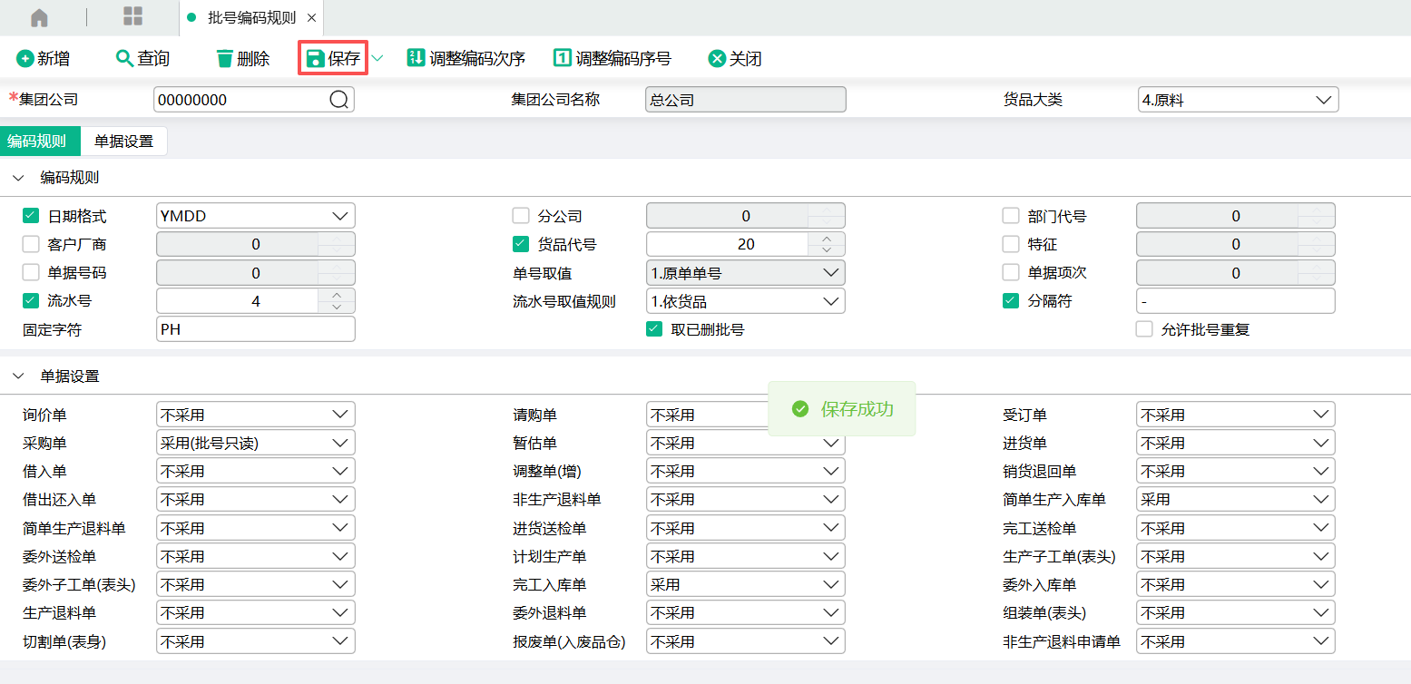 (5)点击保存按钮,则批号编码规则设置完毕。