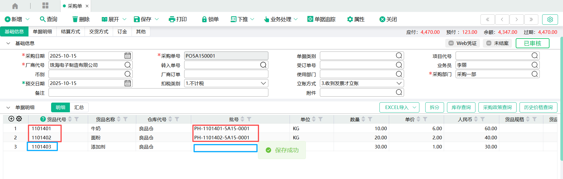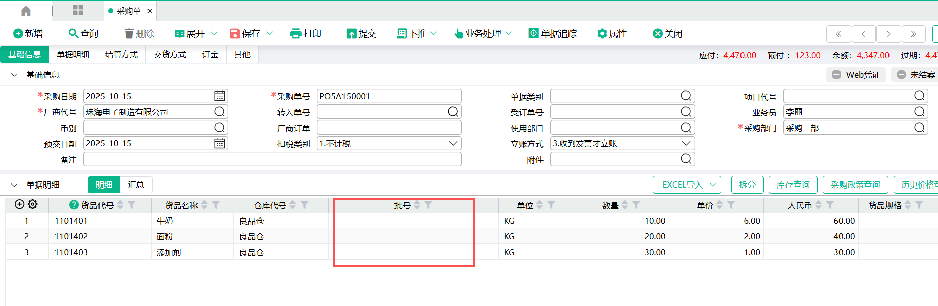 (3)进入总公司,采购单里输入1101401,1101402,1101403三个货品代号,保存后,只有1101401,1101402自动生成批号,1101403的批号不自动生成,因为1101403大类是1.商品,不是4.原料,所以不符合‘批号编码规则’里的设定。批号=固定字符-货品代号-日期格式-流水号。