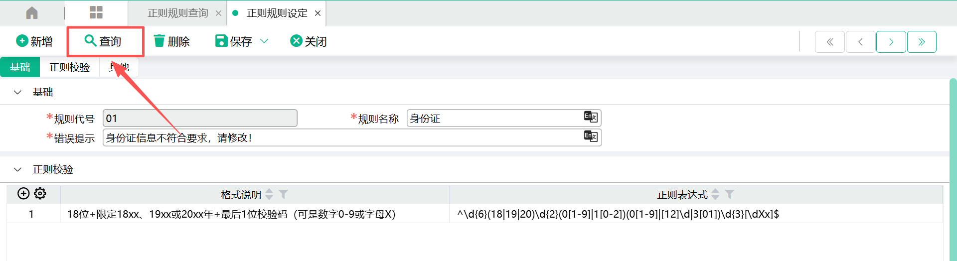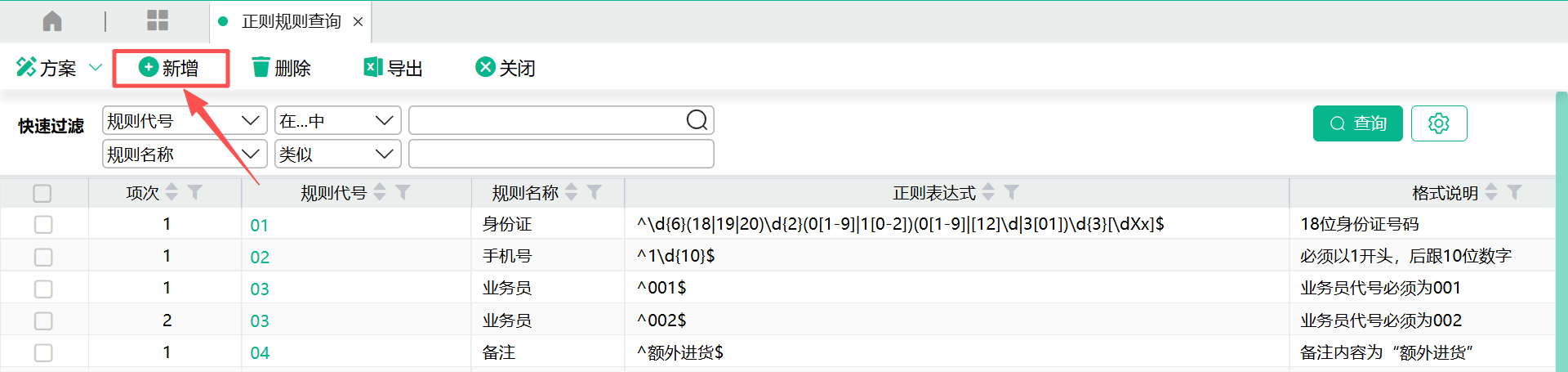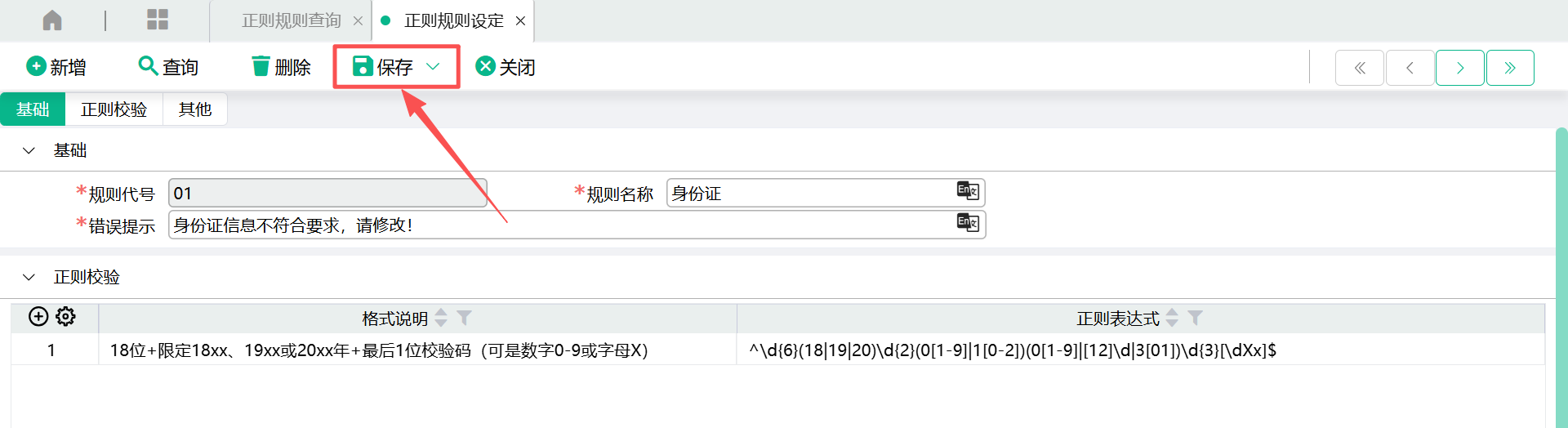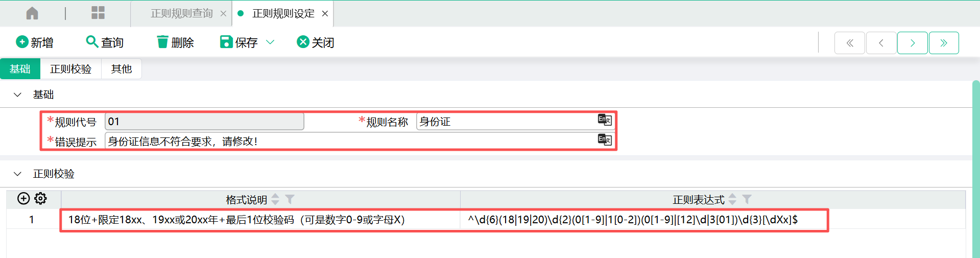 (2)进入设定画面,输入【规则代号】、【规则名称】、【错误提示】、【格式说明】、【正则表达式】