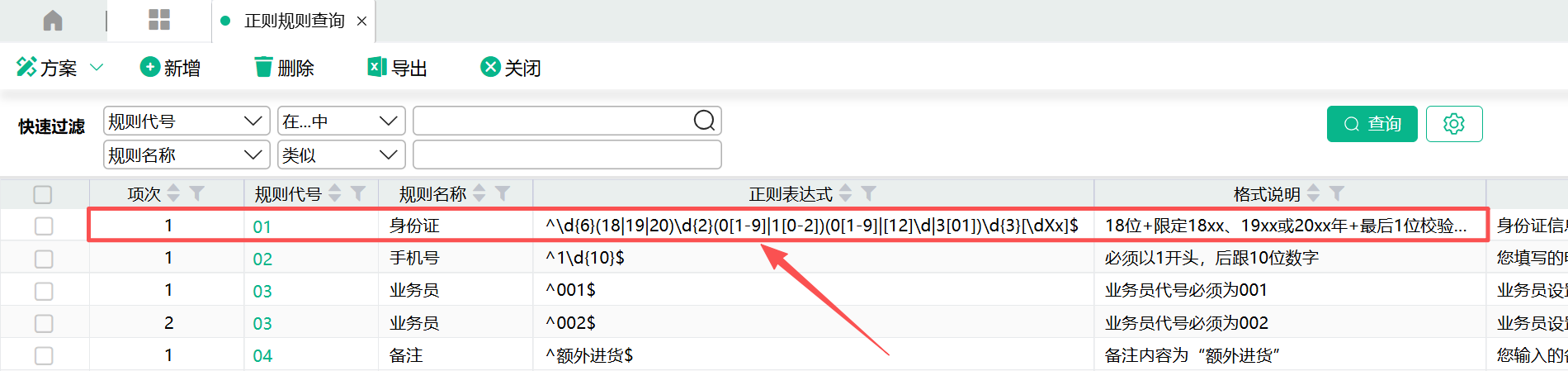- 正则检验时,只要满足任意一种格式要求,则视为满足规则。举例: 同一种证件有可能存在新、旧更替的情况,证件号位数不同,可设置两种不同位数的正则表达式,只要满足任意一种即可通过。
