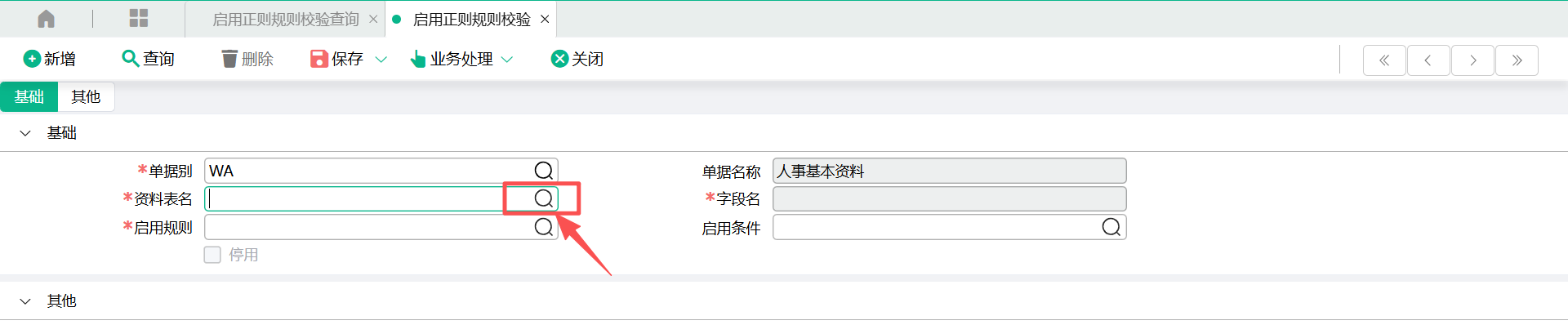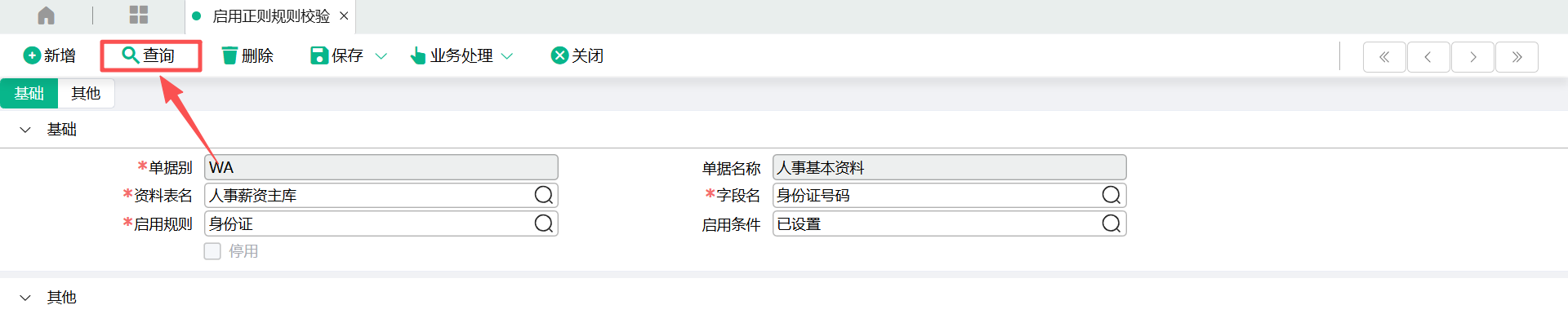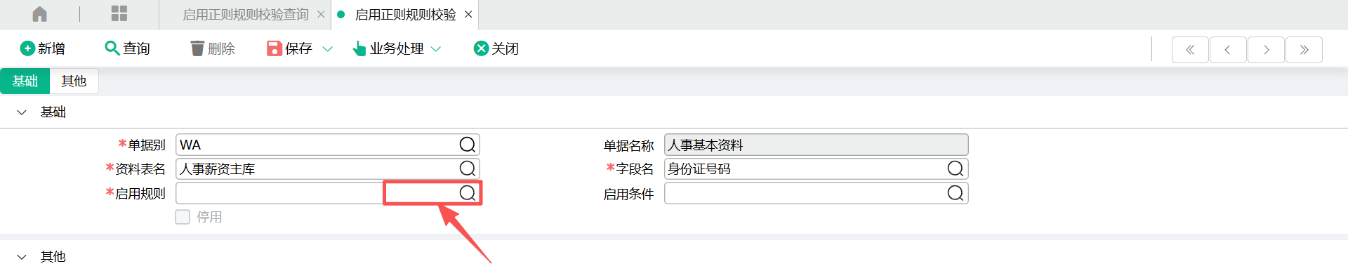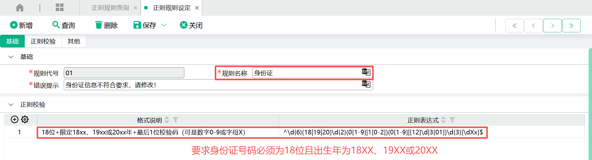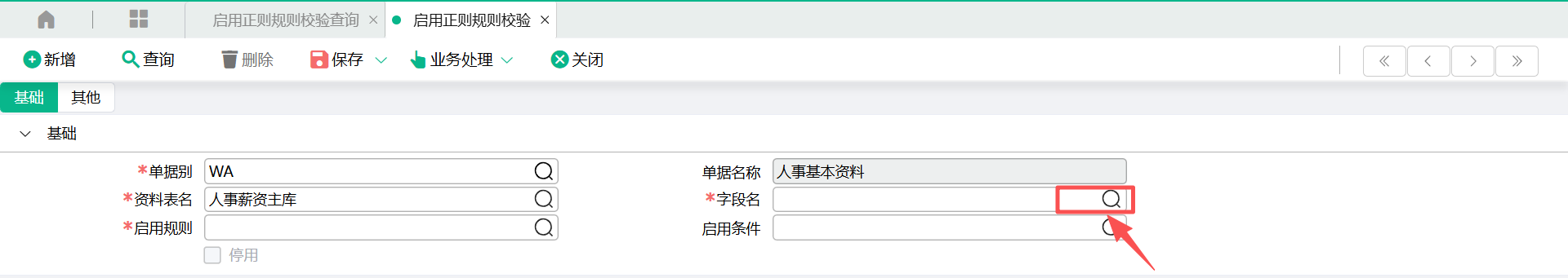 (2)进入“启用正则规则校验”查询画面,点击“新增”按钮