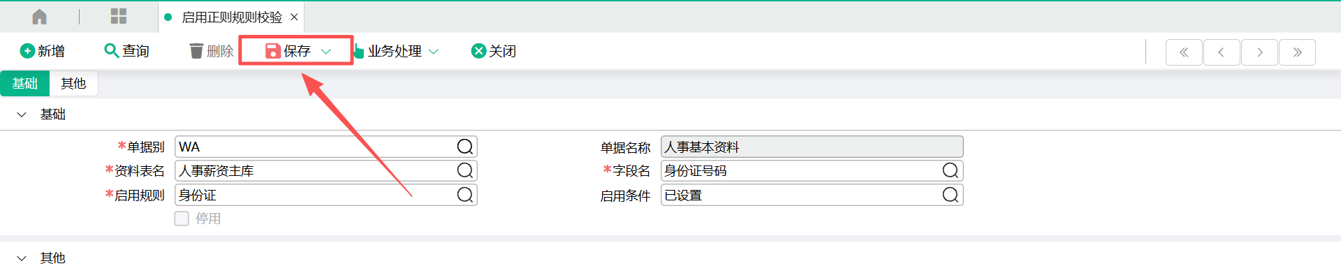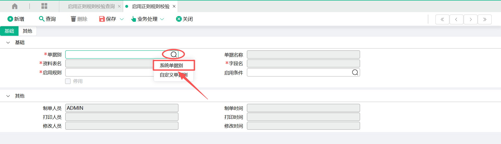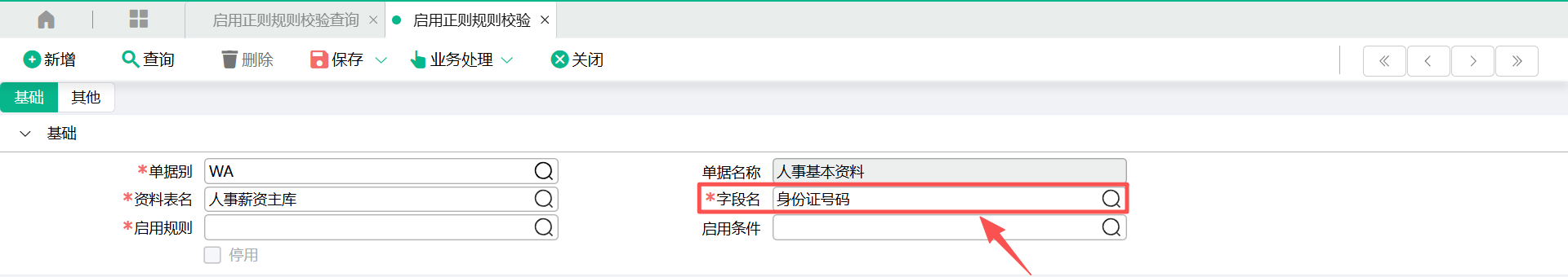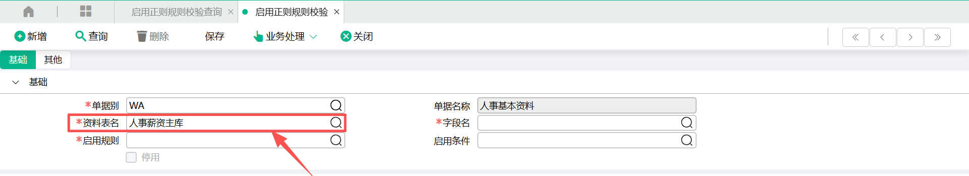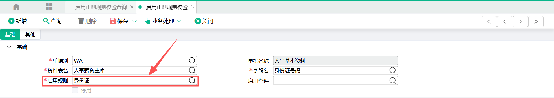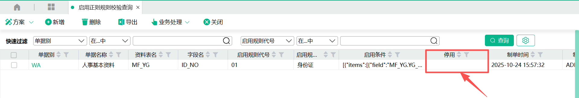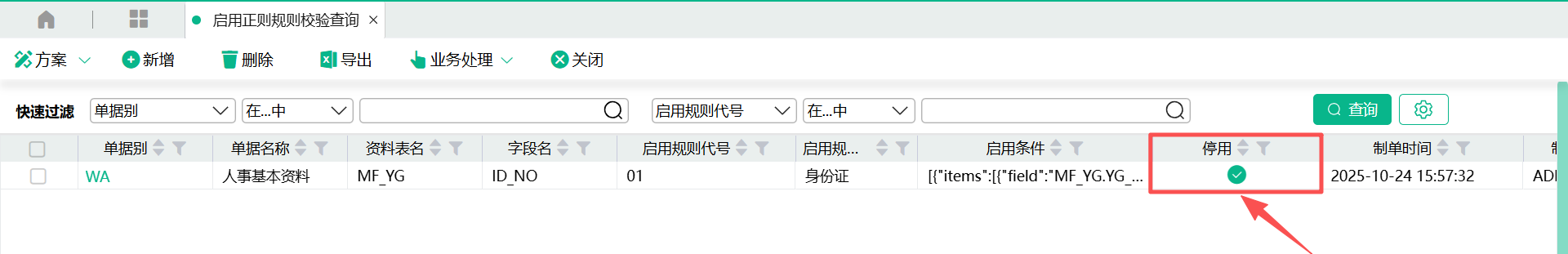 - 启用正则规则校验“停用”:勾选要停用的记录-点击“业务处理”按钮-点击“停用”按钮,停用后,会回写停用标记