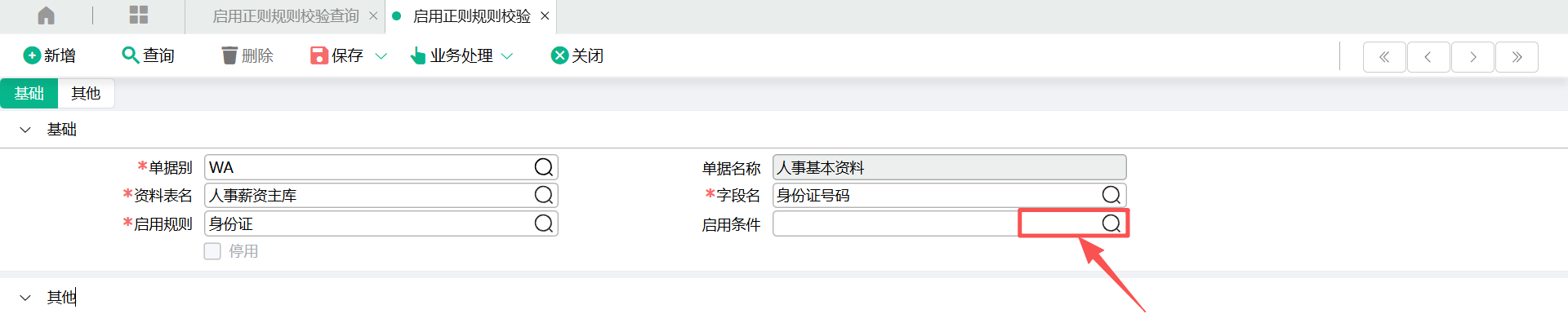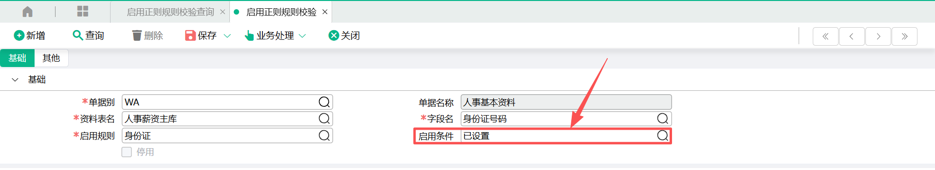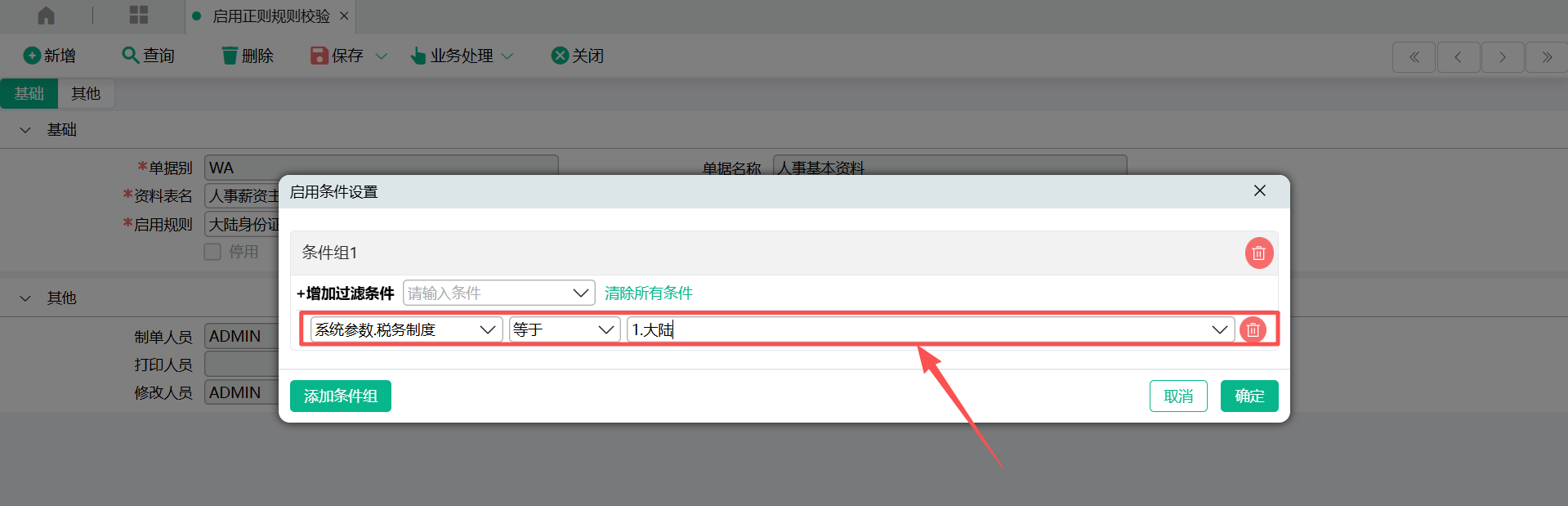 - 启用条件:比如台湾税制和大陆税制的员工身份证格式不一样,会设置当是台湾税制启用哪个正则规则,大陆税制启用哪个正则规则;举例,大陆税制下,校验员工身份证号码信息