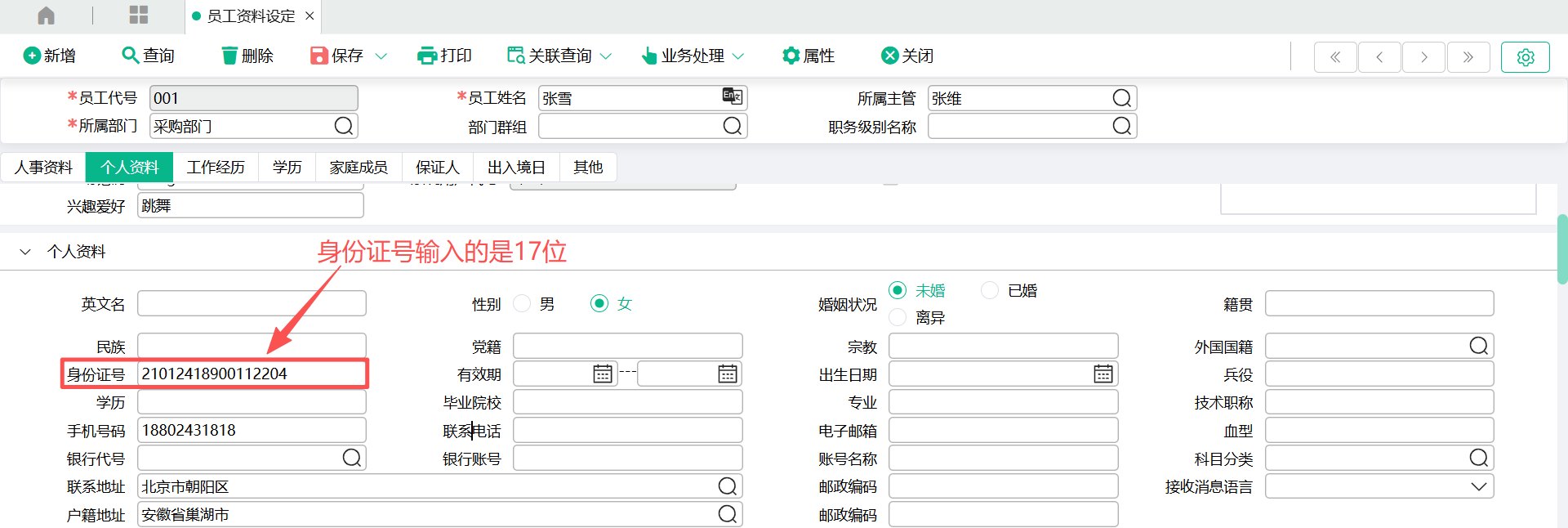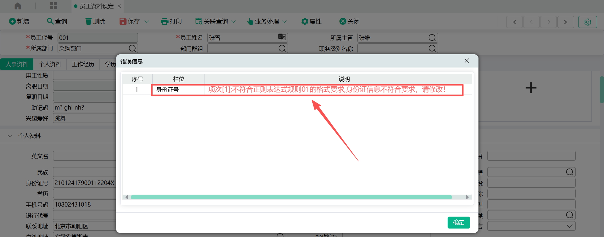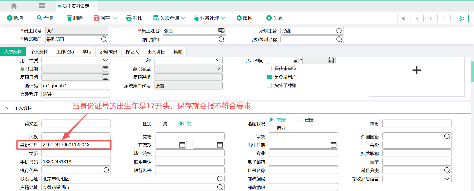 - 当员工001的身份证号对应的出生年非18XX或19XX或20XX时,保存会给出提示