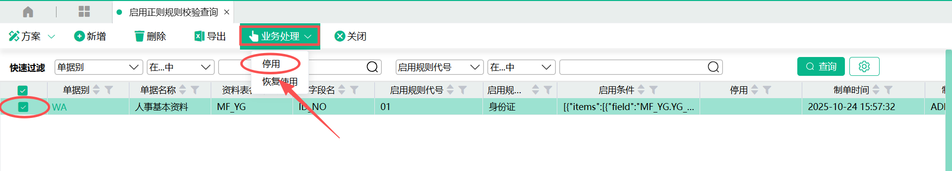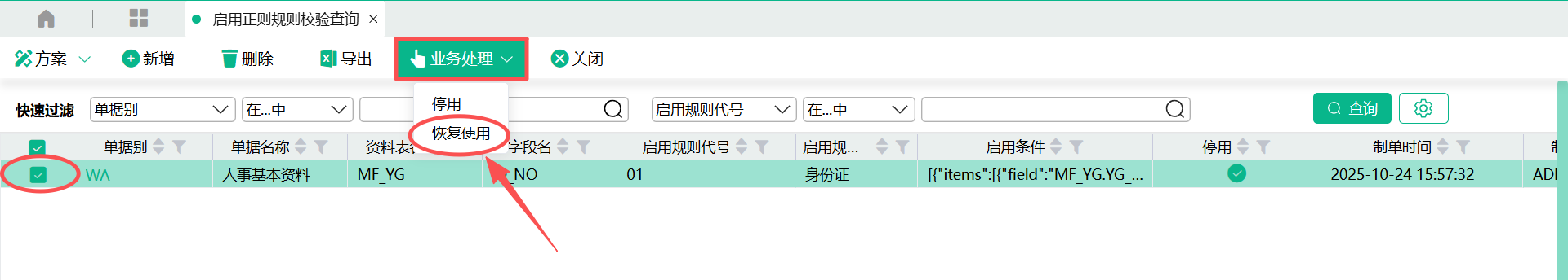 - 启用正则规则校验“恢复使用”:勾选已停用的记录-点击“业务处理”按钮-点击“恢复使用”按钮,恢复使用后,停用标记会清掉