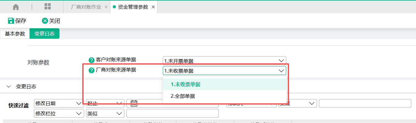 在【系统管理】-【系统参数】-【资金管理参数】中,有控制【厂商对账来源单据】的条件。