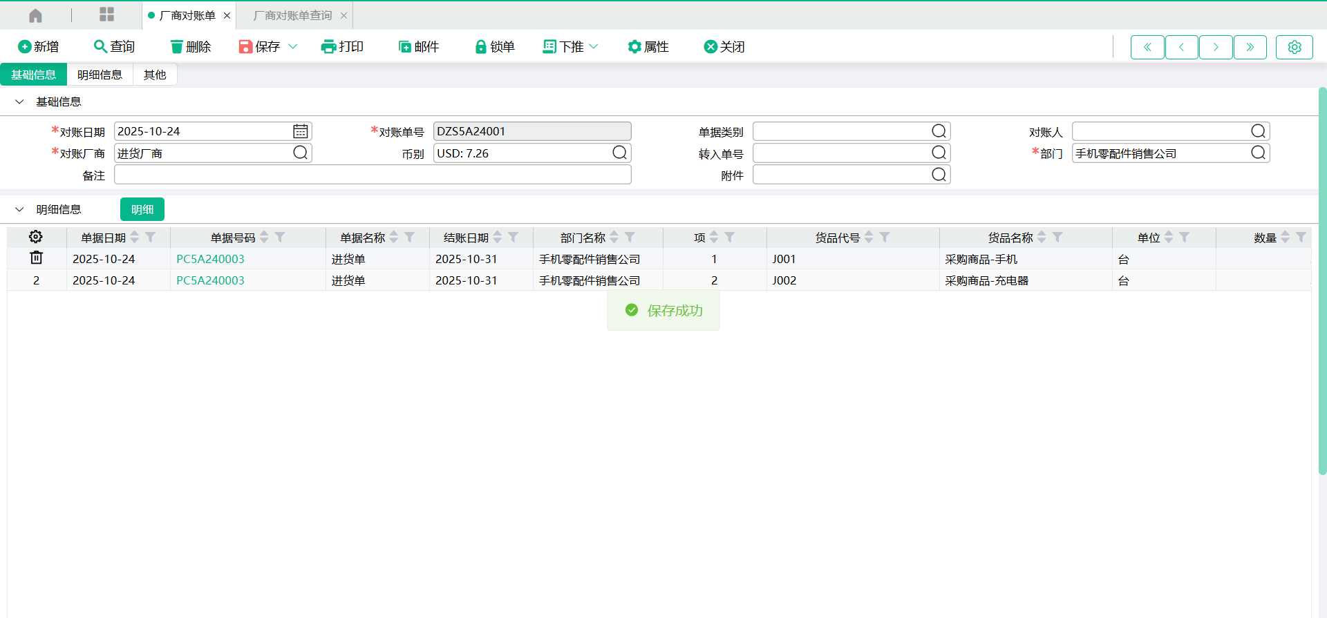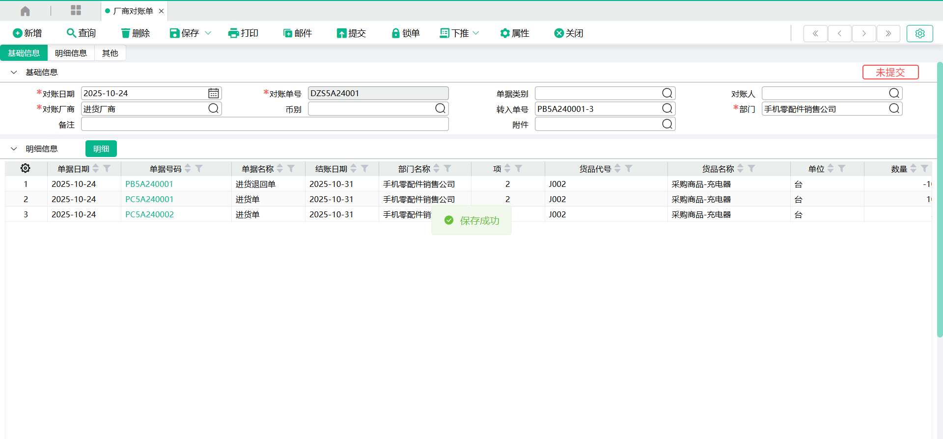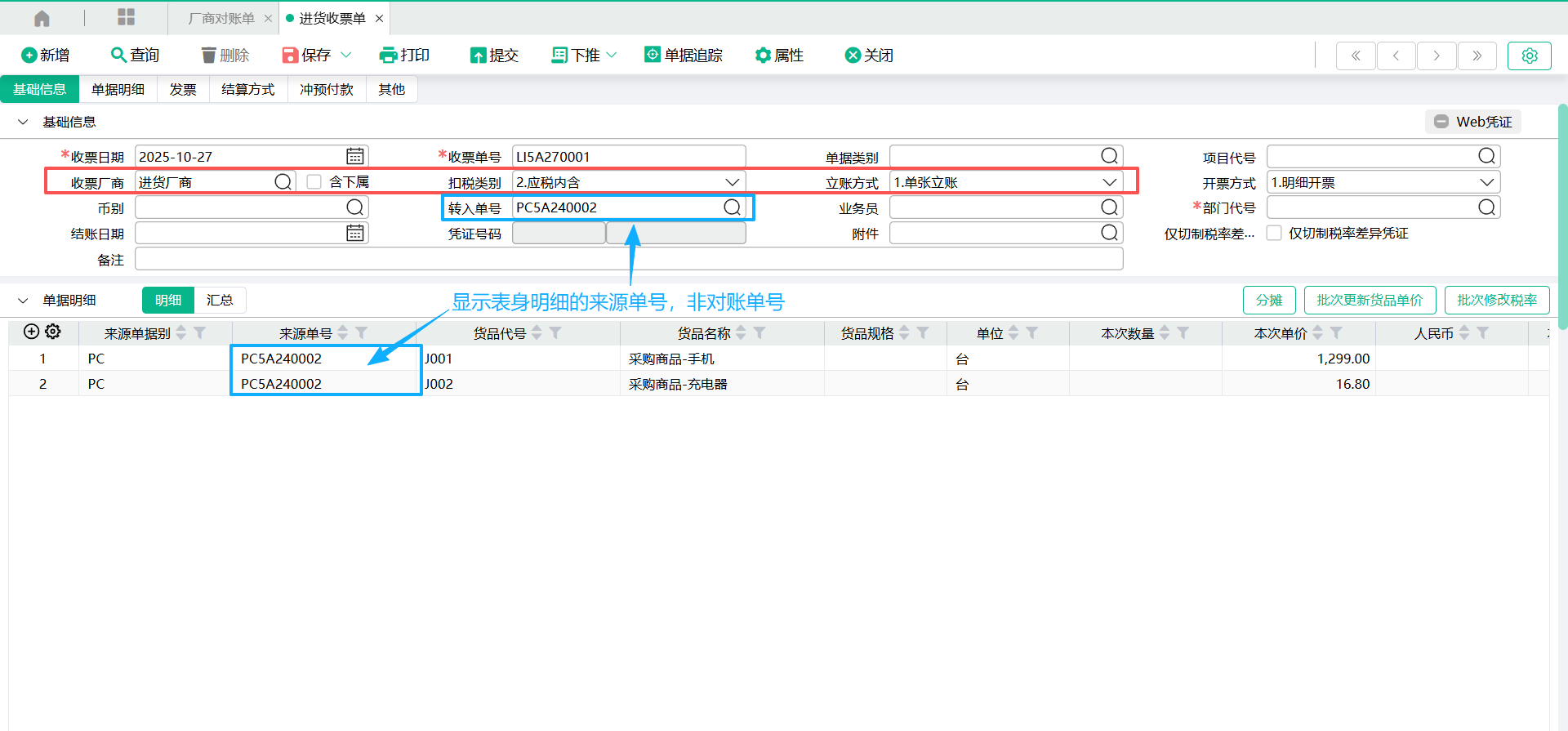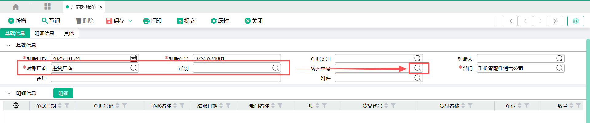 (4)返回【厂商对账单】页面,【转入单号】将显示转入的单号信息,【明细信息】将显示勾选的单据表身明细信息。