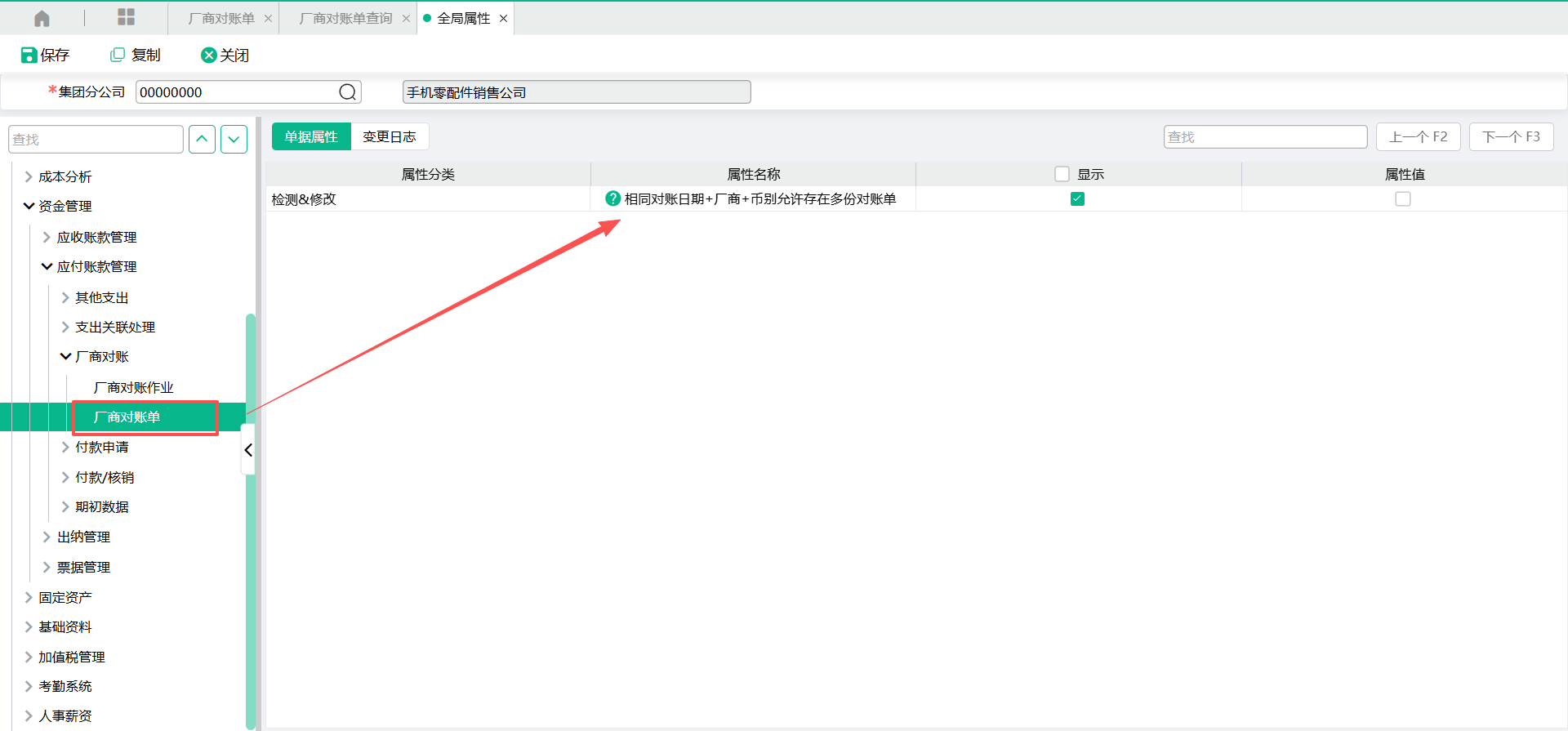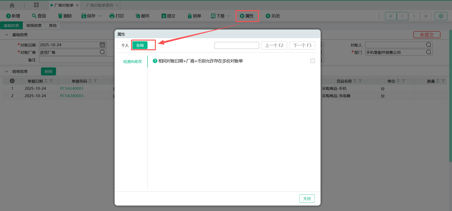 【厂商对账单】有默认的【全局属性】,在对账单编辑页面点击【属性】栏位可查看,需要在【全局属性】设定页面中修改属性设定。(设定路径:系统管理-系统设定-单据属性-全局属性)