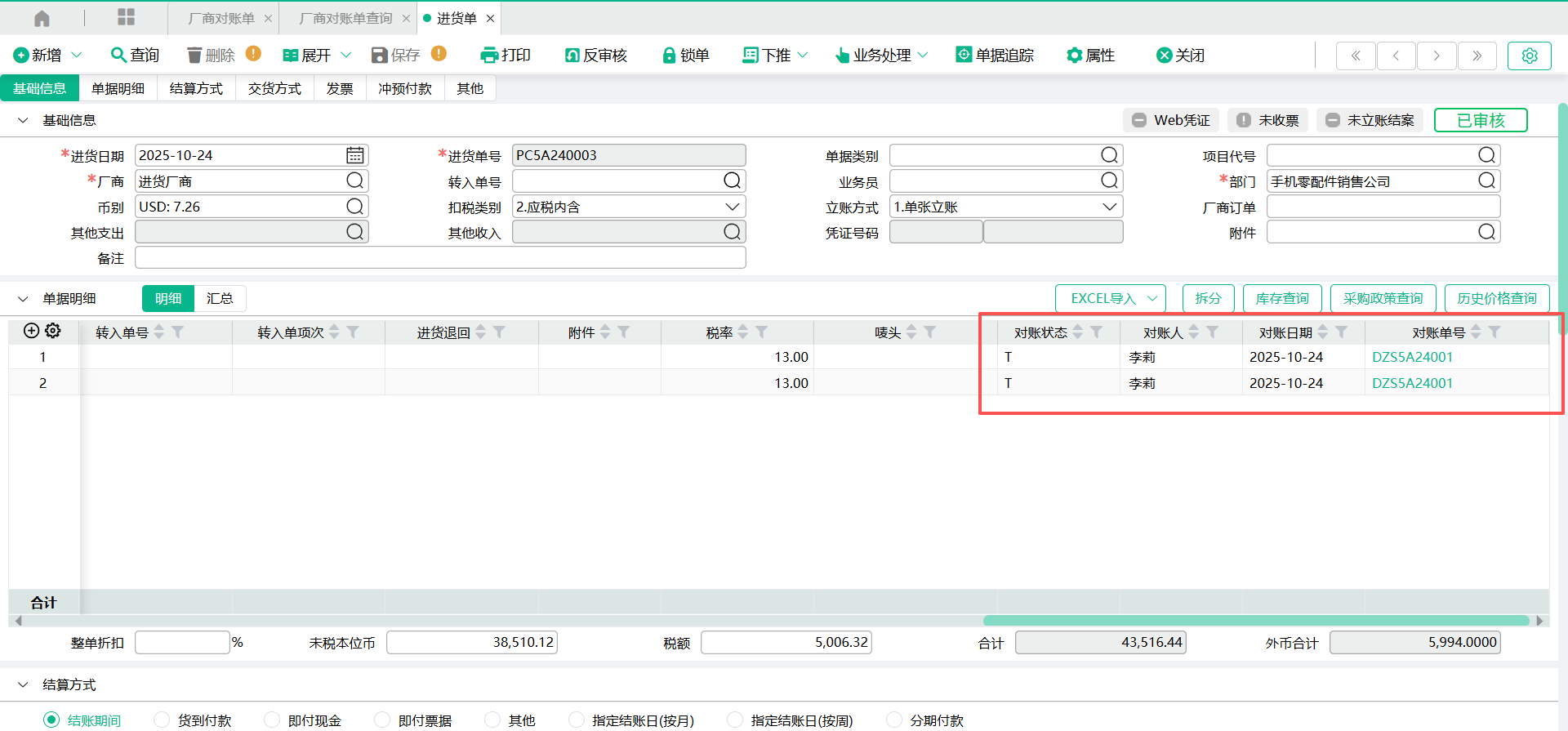 对账单生成后,被对账的来源单据表身明细将显示【对账日期】、【对账单号】、【对账人信息】。对账单终审后,将回写来源单据表身明细的【对账状态】。