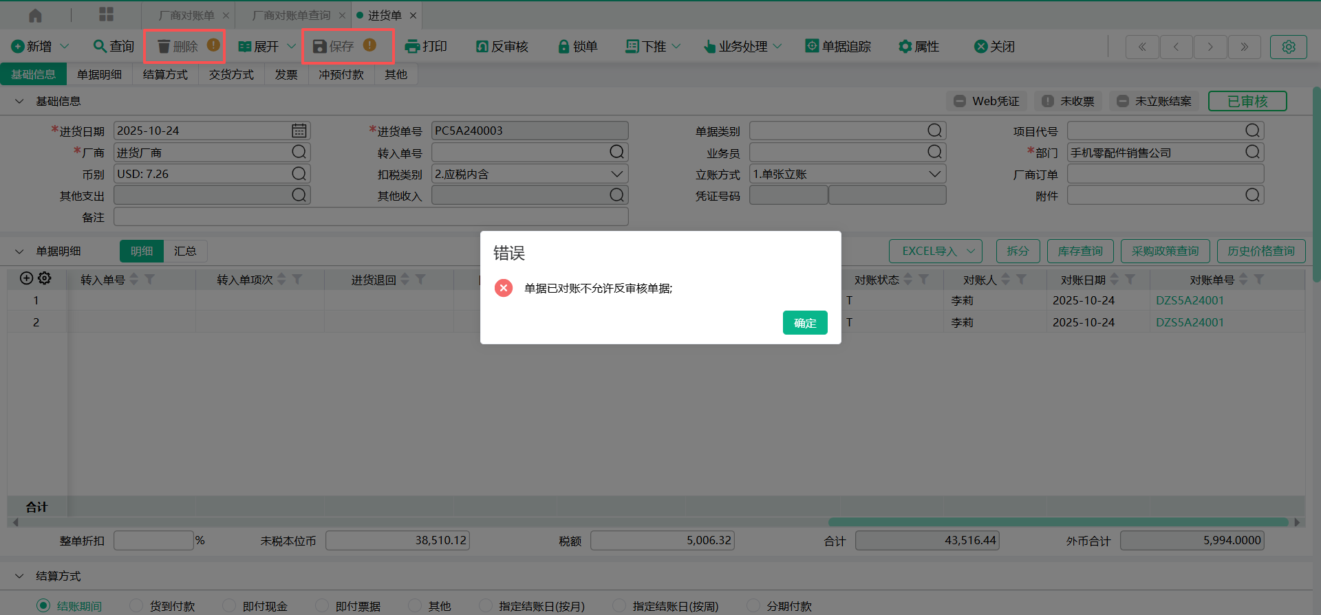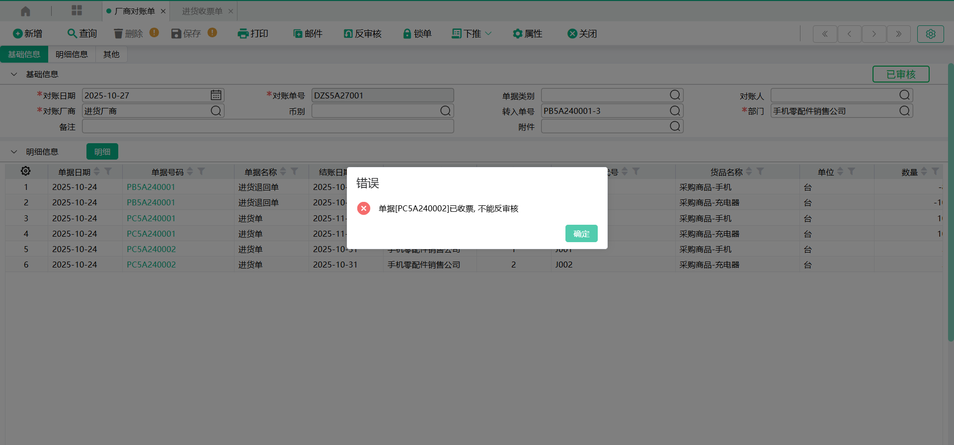 表身明细存在对账信息的来源单据,将不可进行反审核、修改单据、删除单据等操作。