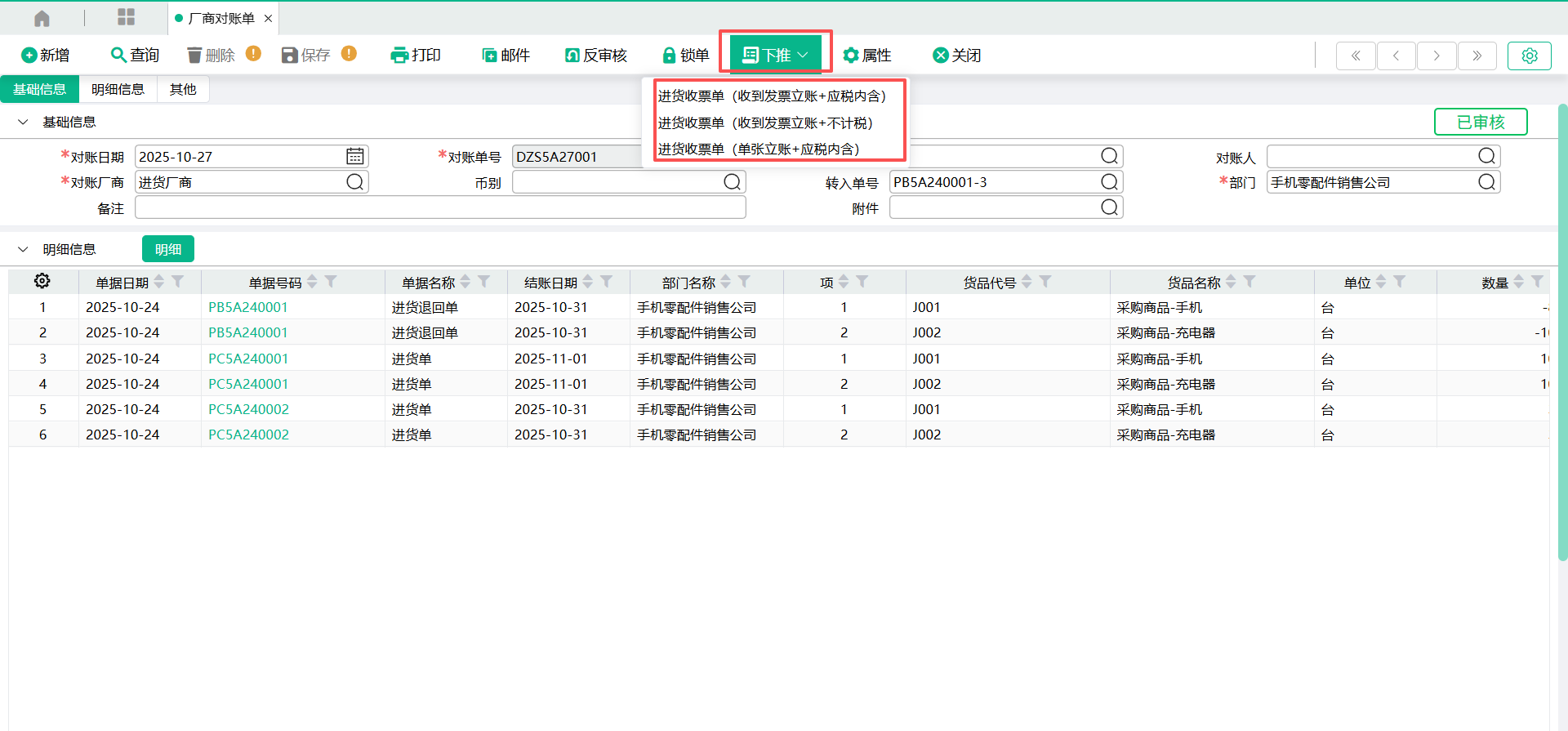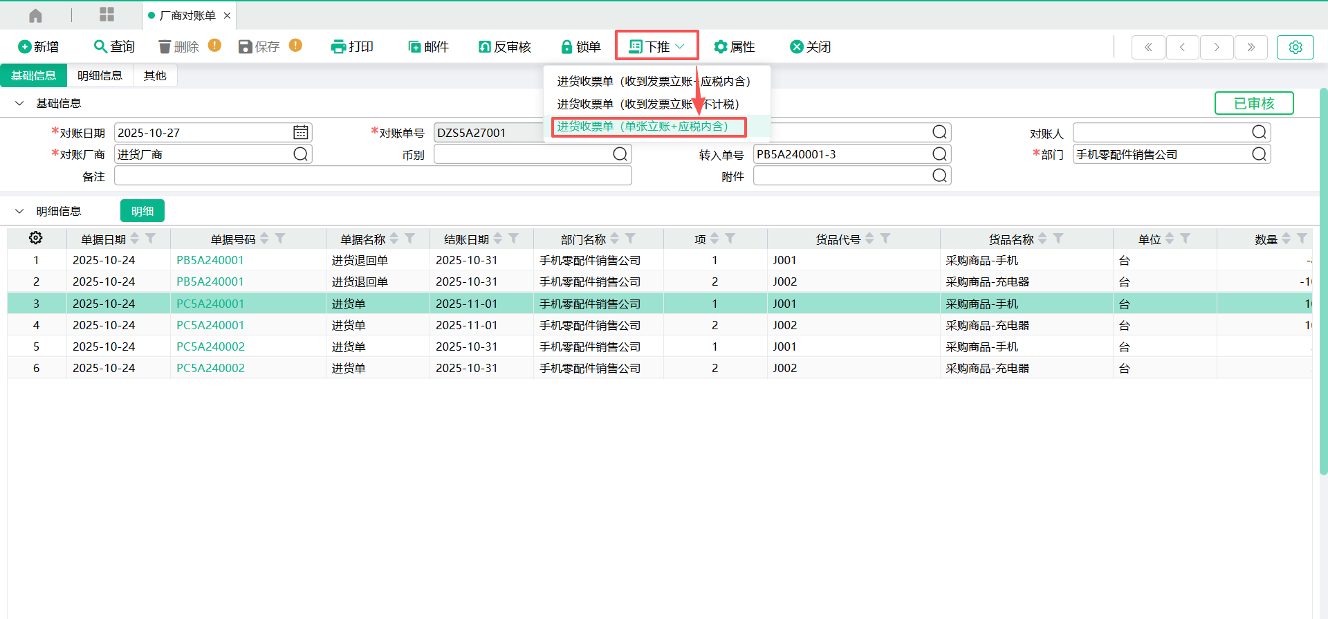 对账单终审后,可通过【下推】功能完成迅速生成进货收票单。