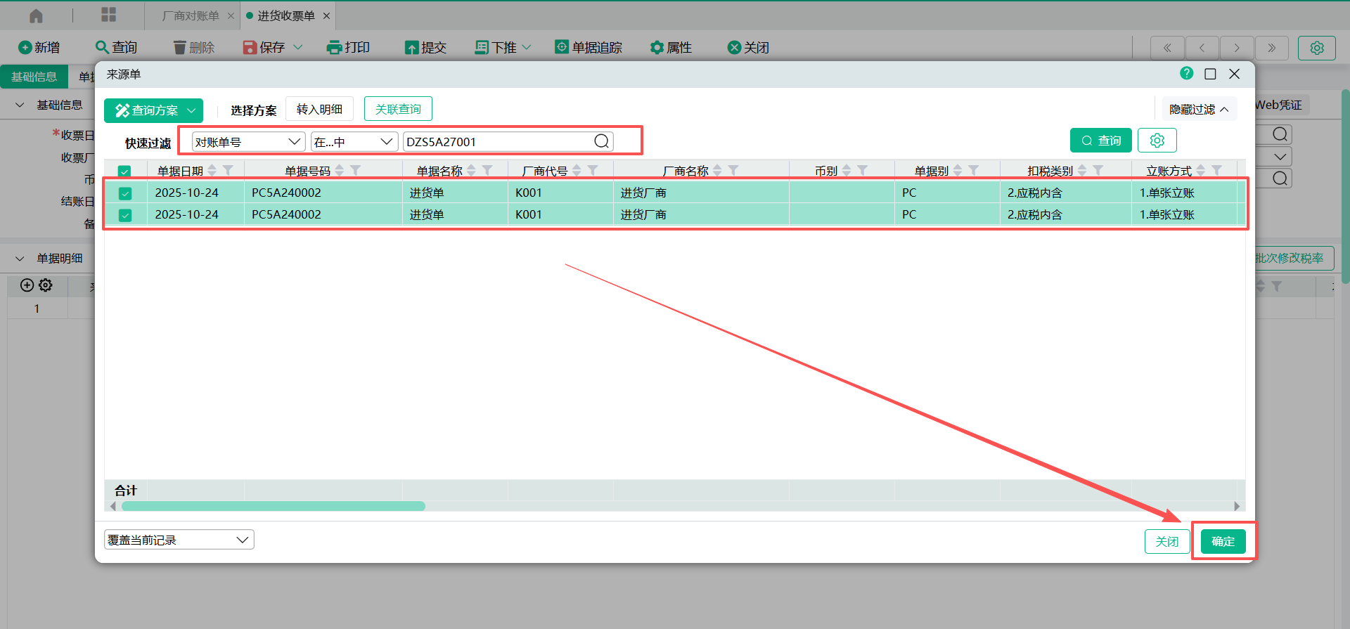 (5)会将【对账单号】作为过滤条件,显示可装入的单据明细。点击【确定】带入收票单表身。