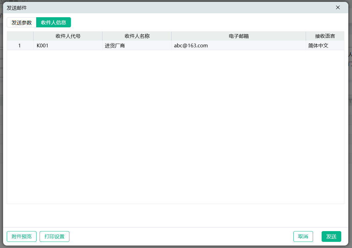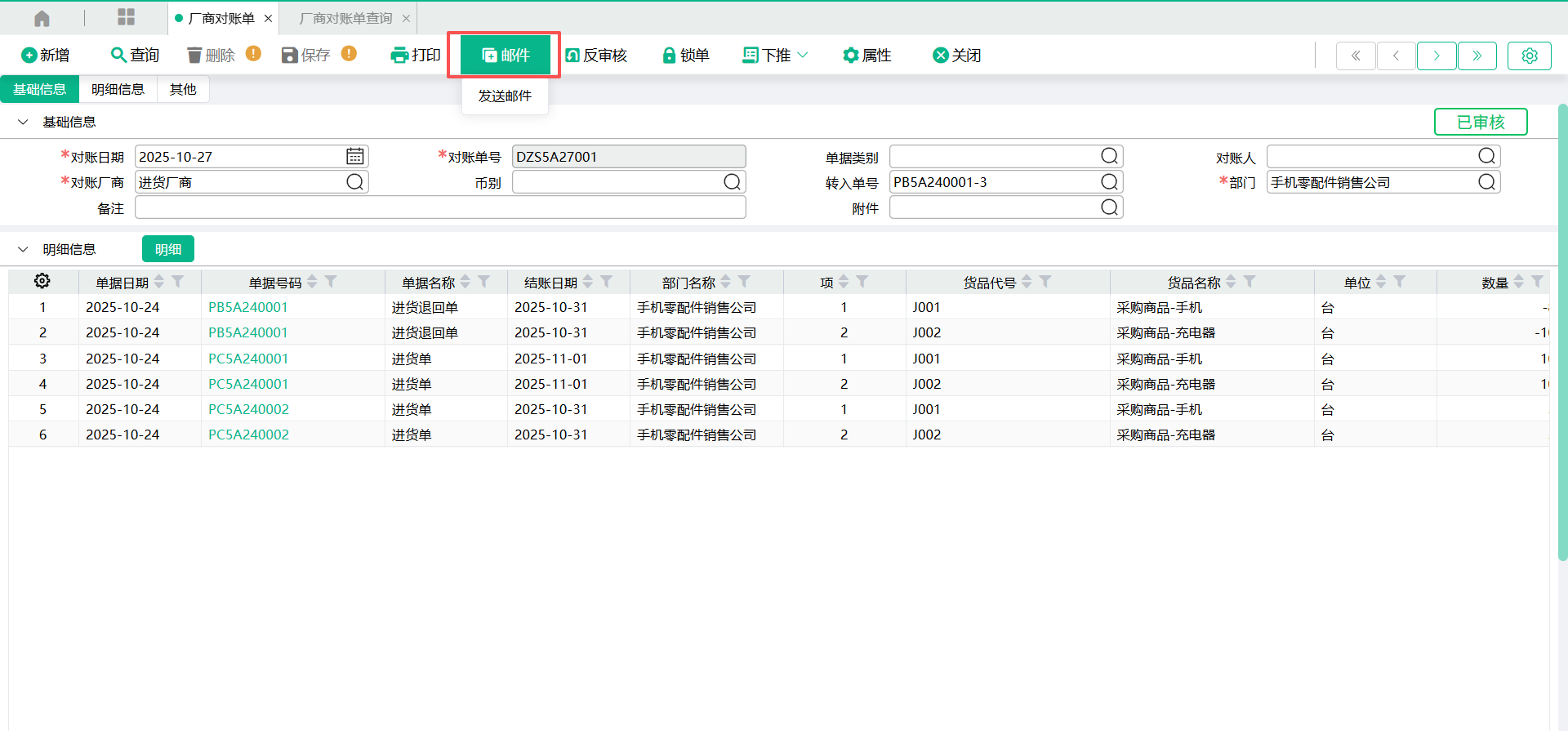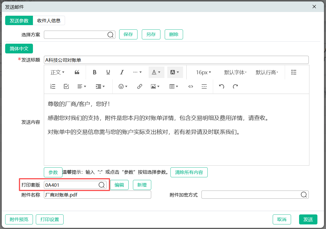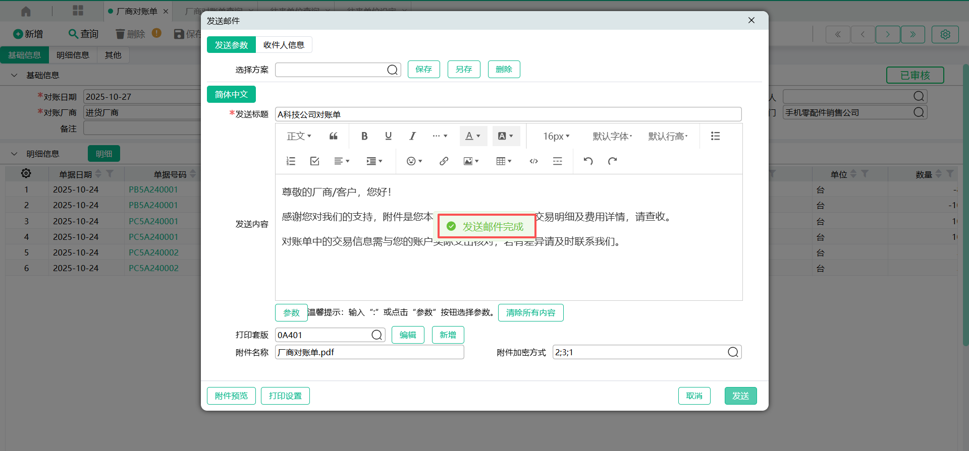 对账单生成后,可将对账单通过邮件发送给对应厂商。
