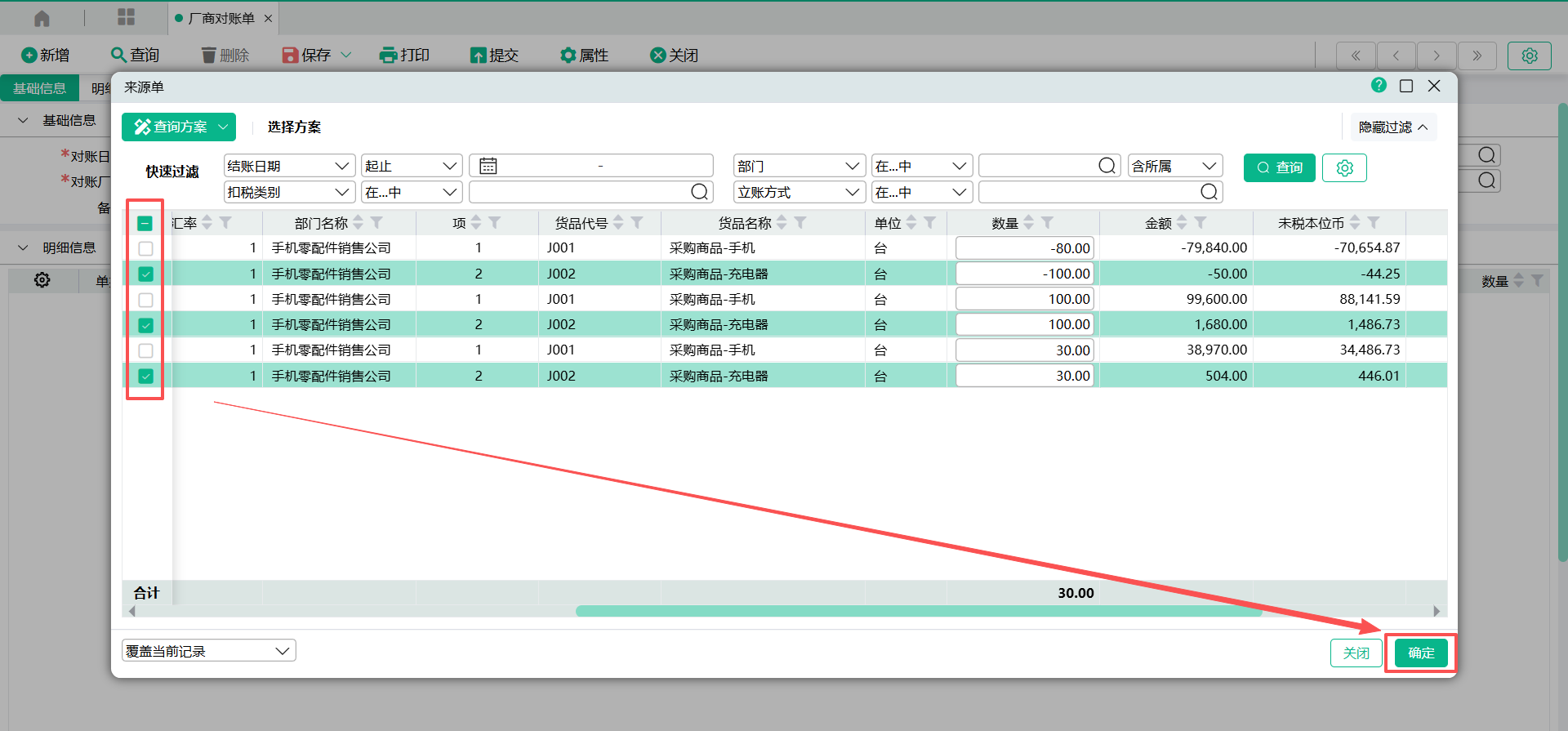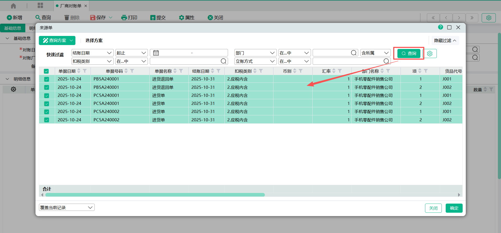 (2)在来源单筛选窗口,点击【查询】将过滤显示符合条件的资料。