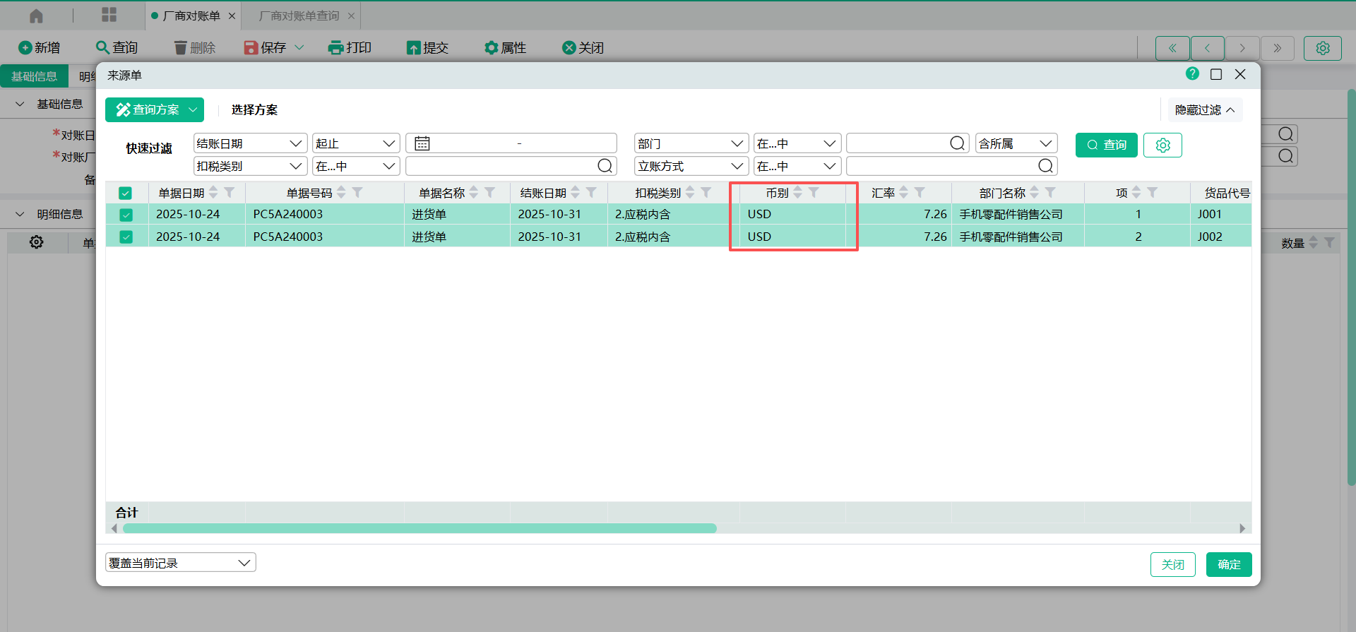 (1)对于币别不相同的单据记录,系统不支持生成同一张对账单的。