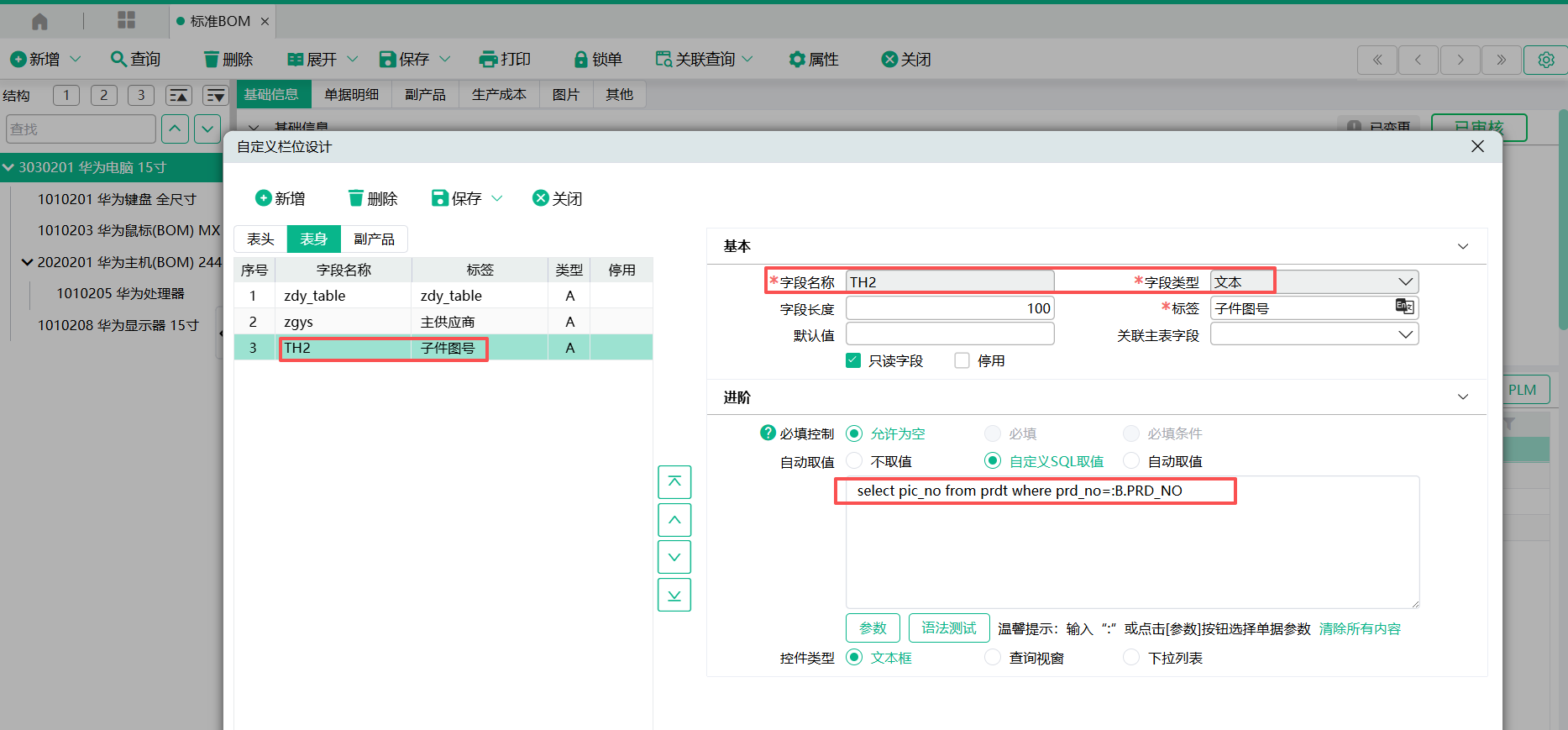 (1)例如:标准BOM表身设置了自定义字段TH2(大写),取货品档里的图号栏位值。