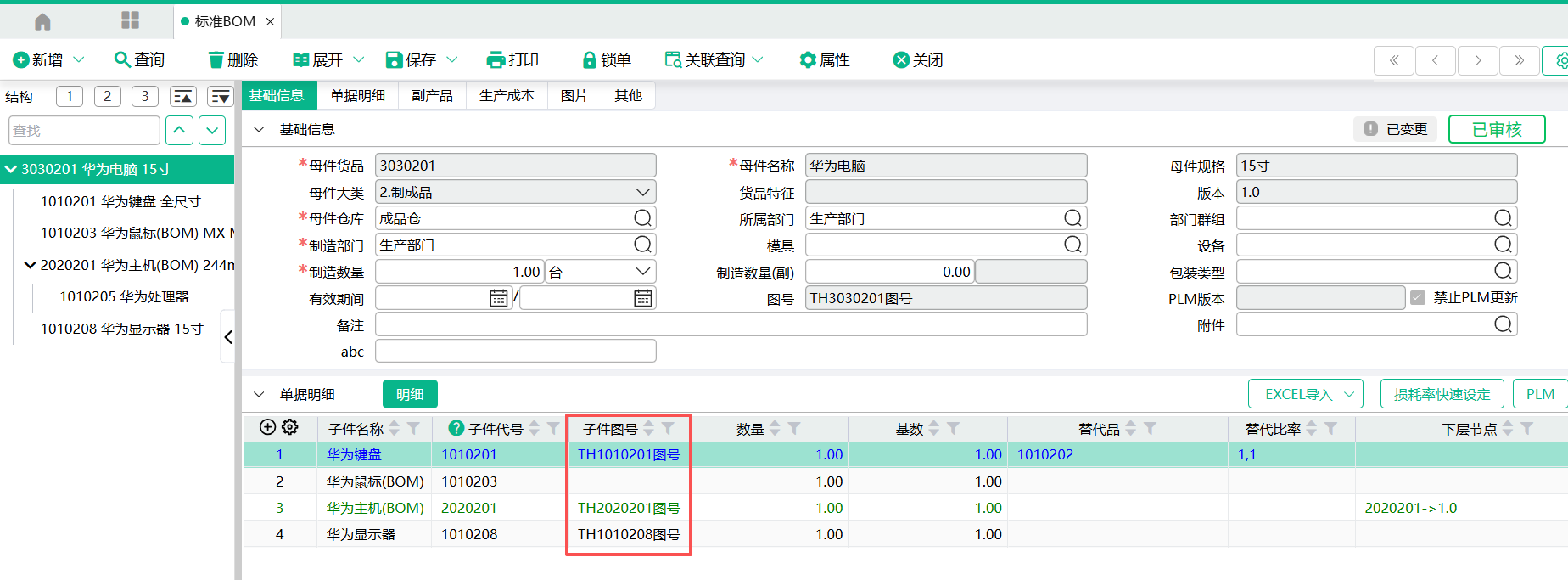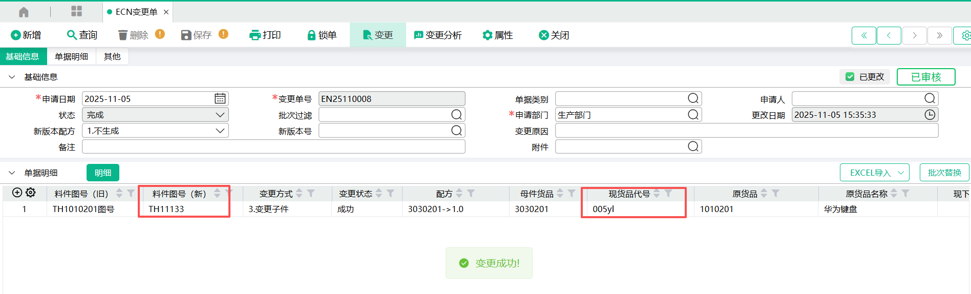 (5)执行更改之后,子件代号变更,对应的自定义字段也变更过来。