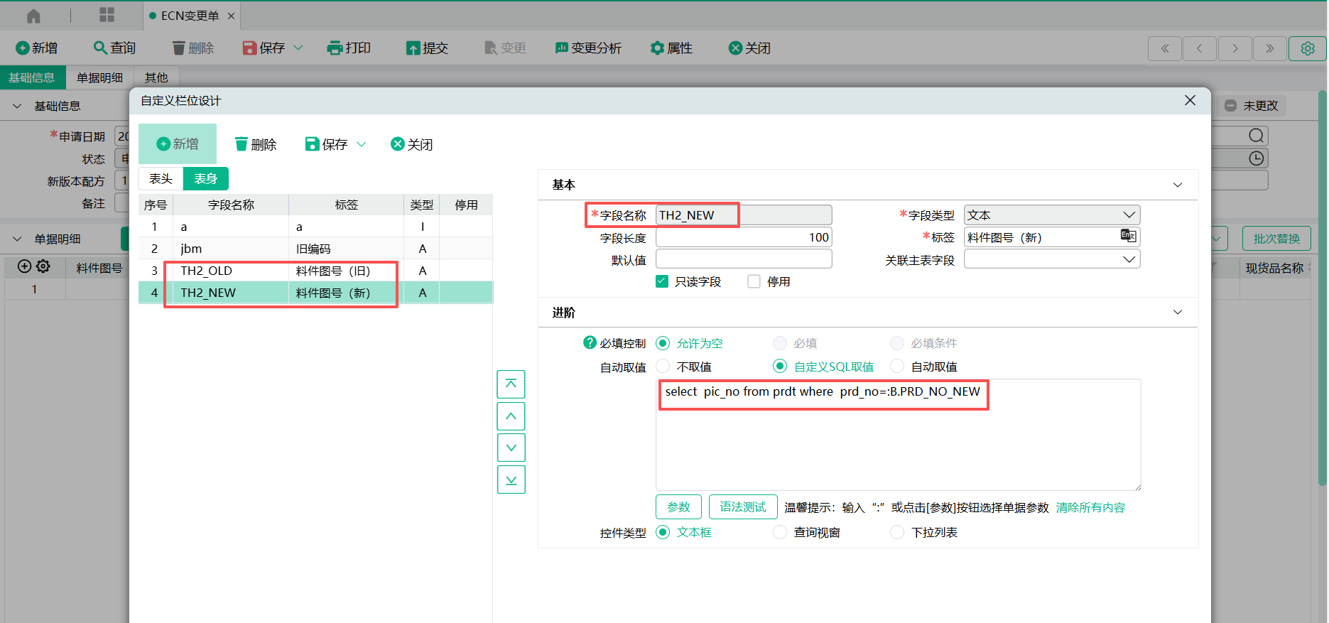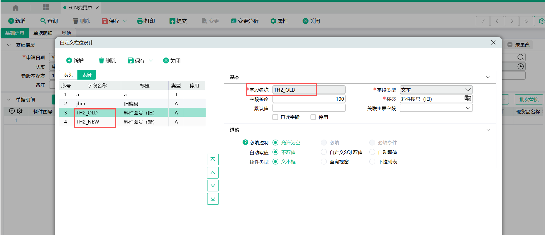 (2)当ECN变更单变更子件代号,或者新增子件时,需要同步修改标准BOM里表身的自定义字段TH2的值。这时可以在 ECN变更单里设置表身自定义栏位 TH2_OLD和 TH2_NEW,类型,长度与标准BOM的TH2类型一样。