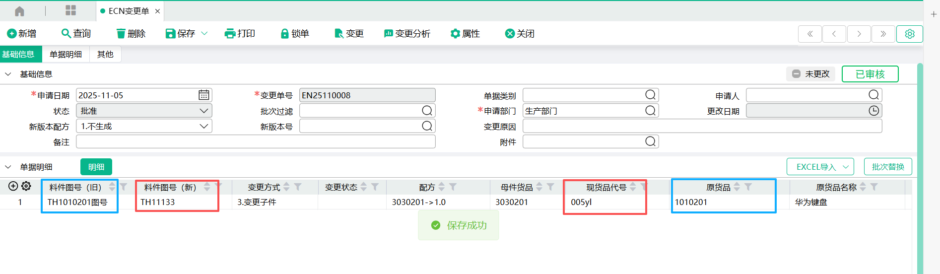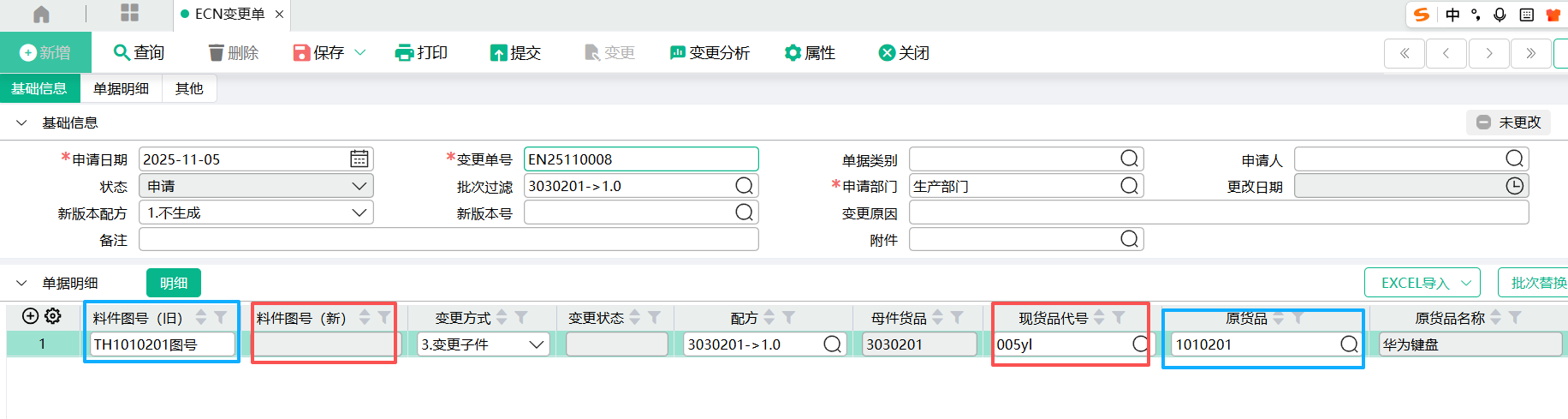 注意:变更标准BOM自定义字段,需要在ECN变更单新增自定义栏位,自定义格式为XXXX_NEW,XXXX_OLD,类型和长度需与BOM表里的自定义栏位保持一致。