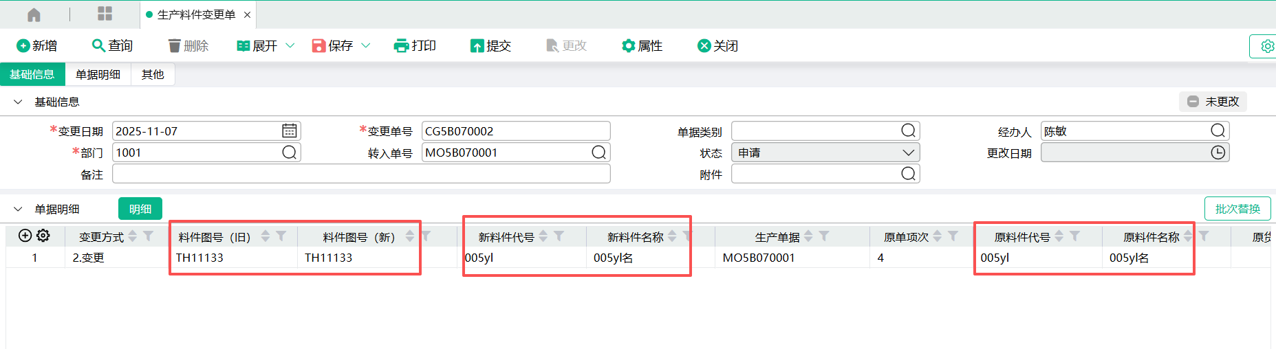 生产料件变更单变更生产子工单表身自定义栏位示例