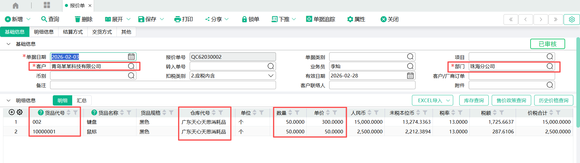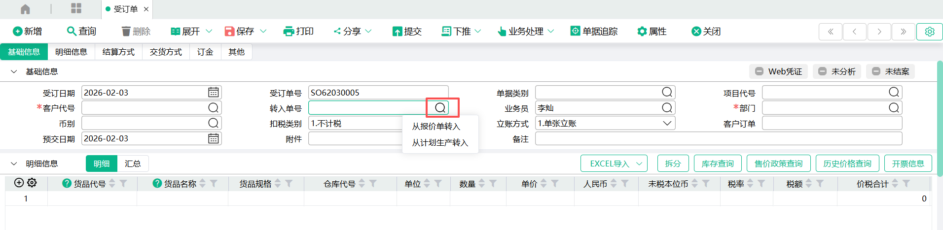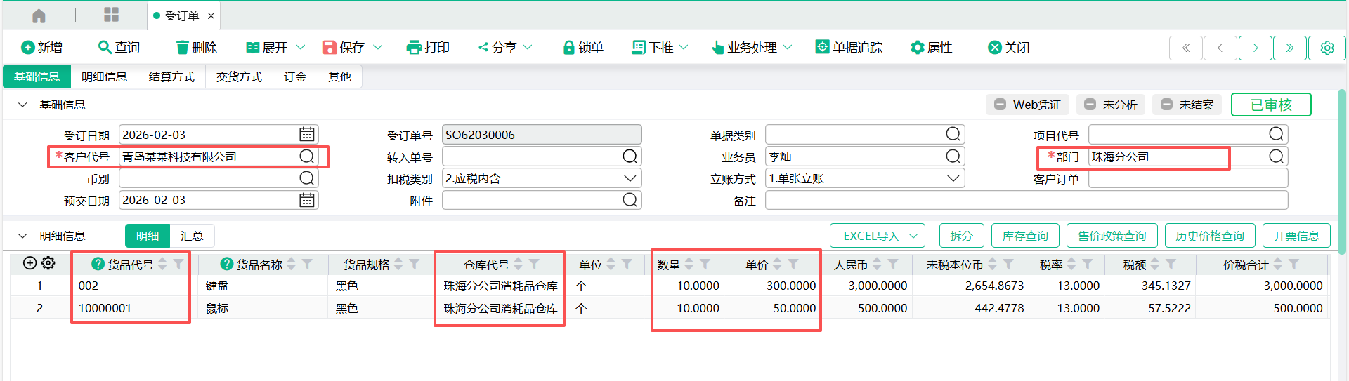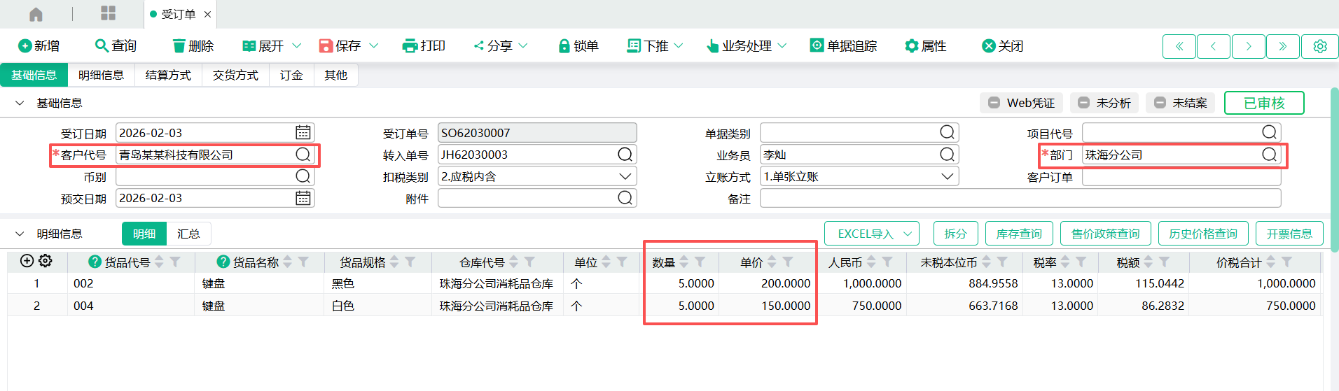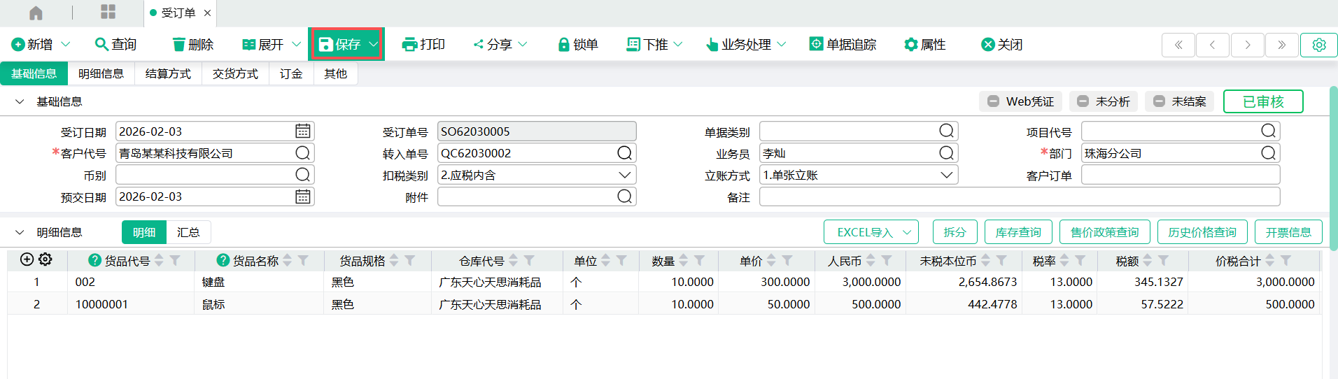 (1)进入【受订单】页面,输入表头客户代号、部门,输入表身货品代号、仓库代号、数量、单价,点【保存】。