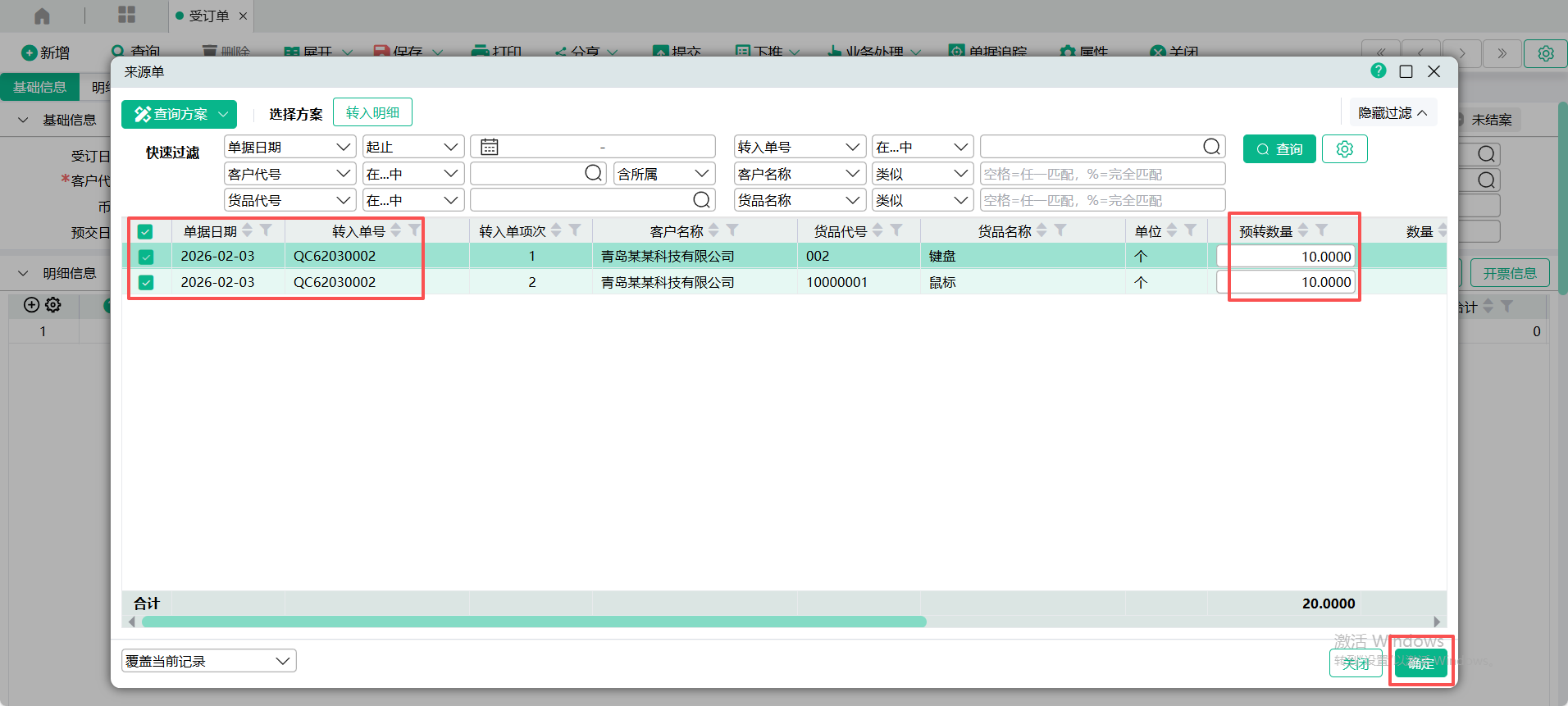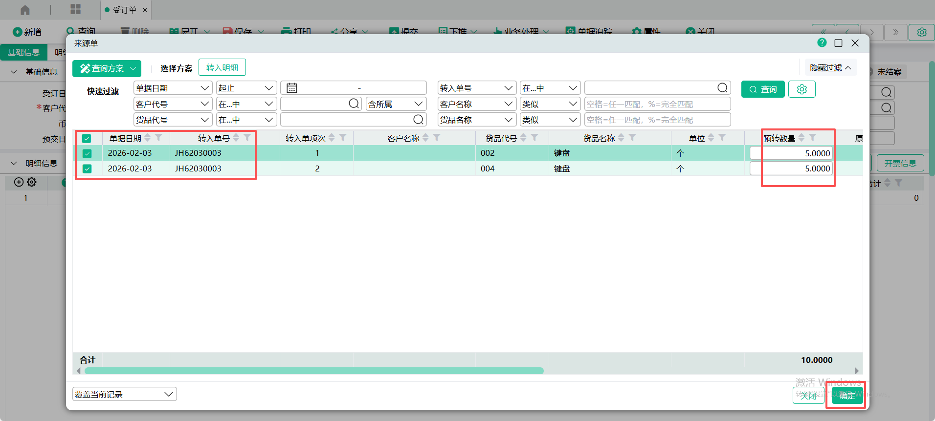 (2)进入【受订单】页面,点入表头【转入单号】查询窗口,输入过滤条件,查询出报价单,勾选要转入的单据记录,点【确定】 ;